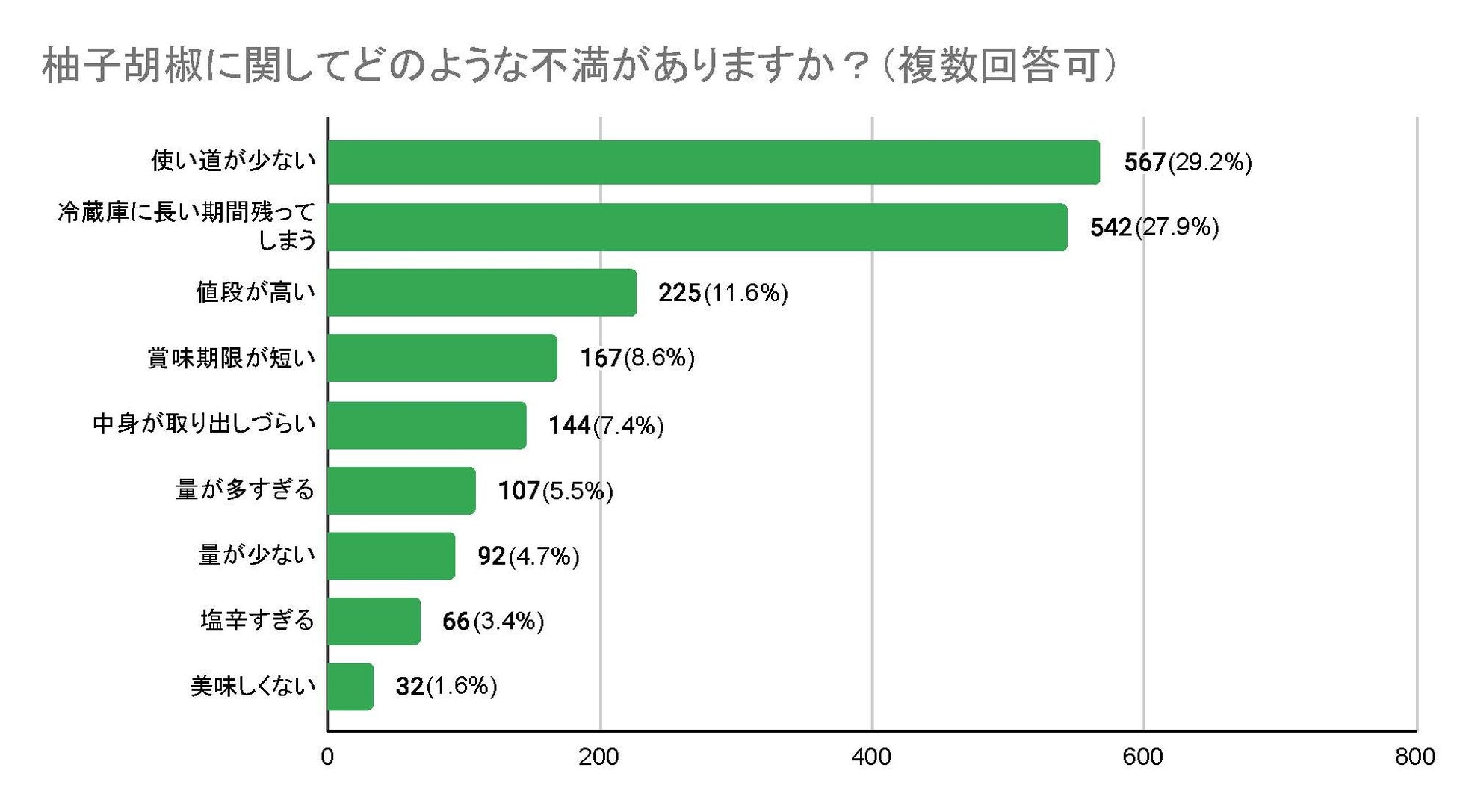 弊社が実施した柚子胡椒に関する調査では、「柚子胡椒への不満点」として、29.2%が「使い道が少ない」、27.9%が「冷蔵庫に長い期間残ってしまう」と、柚子胡椒の使い道があまり多くないこと、使い切るまでに時間がかかってしまうことに対して最も多くの方が不満を感じていることが分かりました。