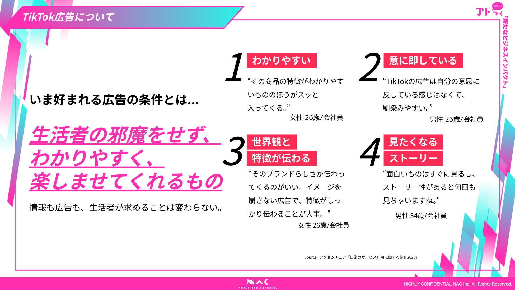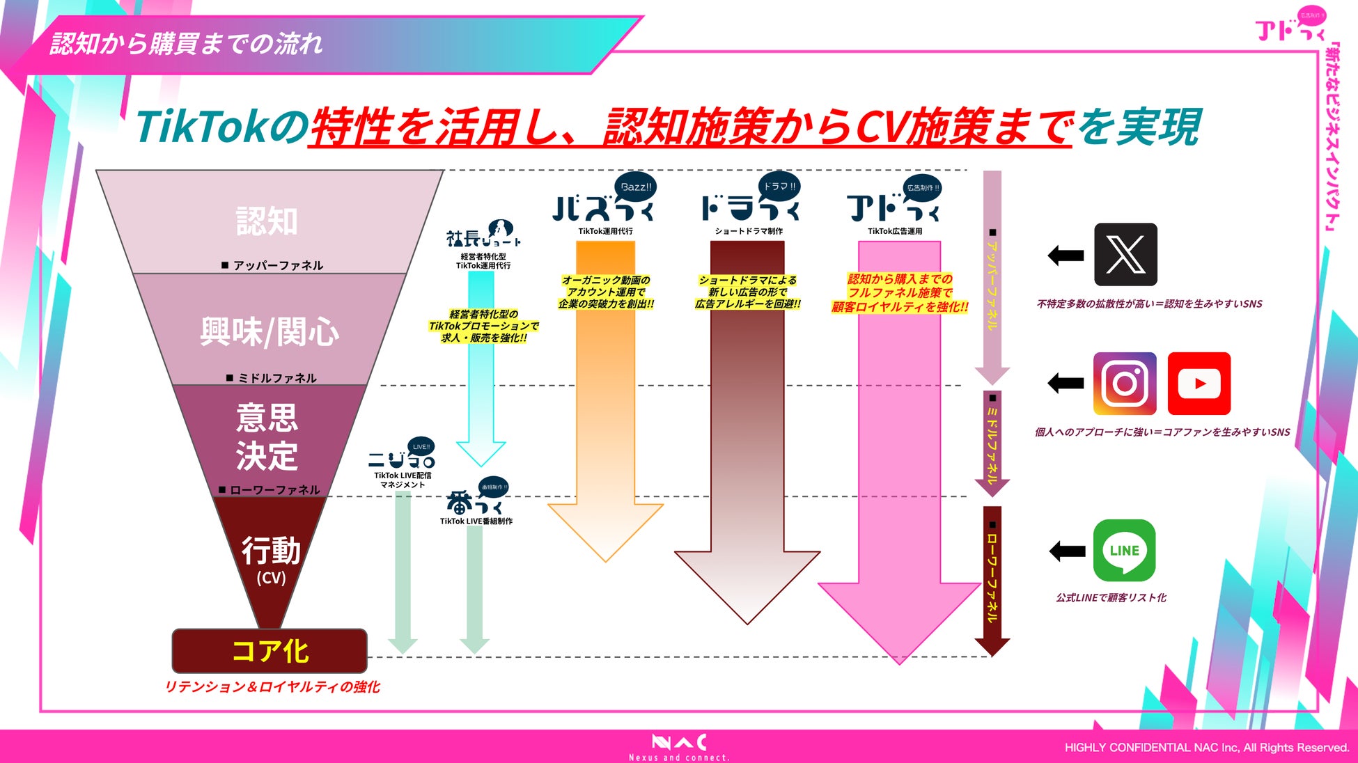 株式会社NAC(本社:東京都新宿区、代表取締役:植田泰介)は、新しいTikTok広告運用・制作サービス「アドつく」を開始いたします。このサービスは、TikTokの広告とオーガニックコンテンツを掛け合わせ、自然な形でブランド認知とエンゲージメントを向上させることを目的としています。広告の強力なターゲティングとオーガニックなコンテンツ拡散の相乗効果により、より効率的なブランド訴求を実現します。