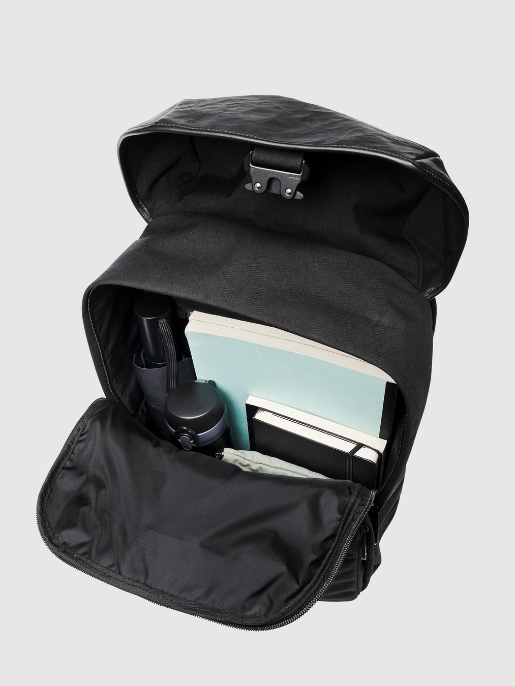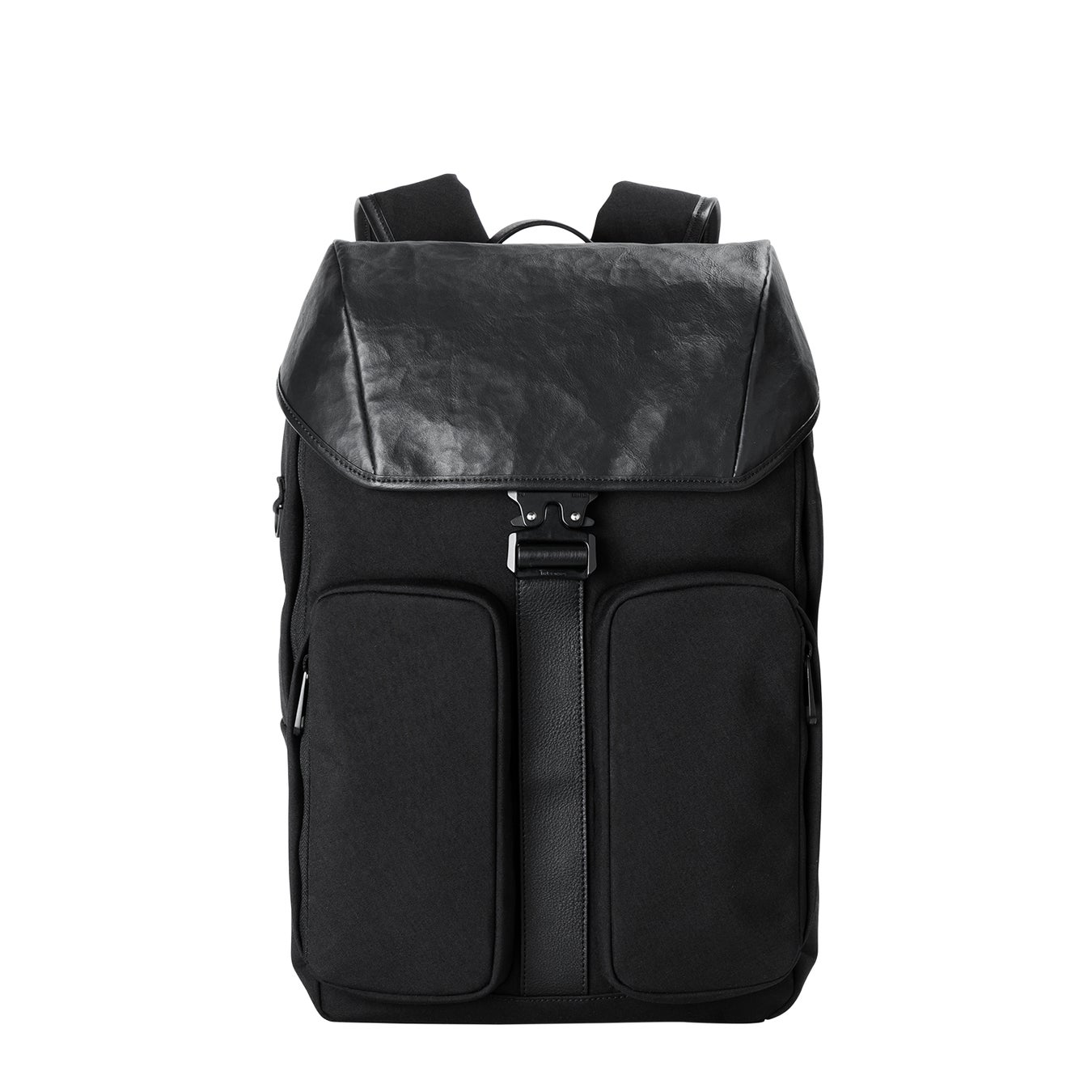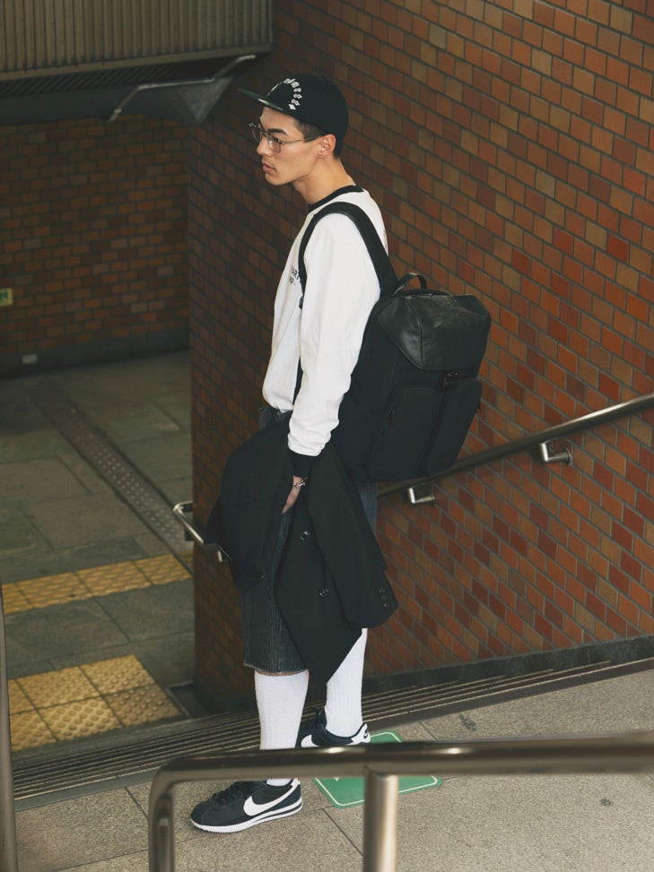 直線的なシルエットとレザーの表情がスマートな印象を与え、ビジカジスタイルやジャケットスタイルに合わせやすいバックパックです。ナイロン素材による軽量化や充実したポケットで、ビジネスシーンに好適な機能性も備えました。