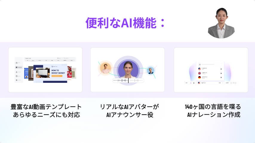 顔出したくない場合も、AIアバターが代わりに紹介してくれる動画を作成できます。