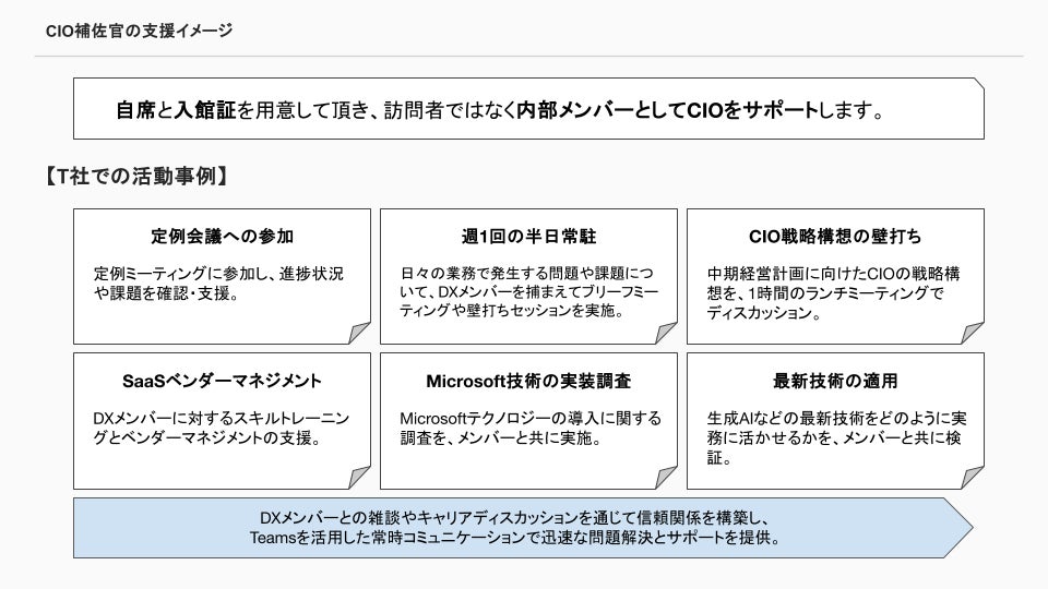 CIOと密に連携しながら、長期的な伴走型サポートを提供します。単なる一時的な支援ではなく、CIOやDXチームと一体となって現場でのDX浸透を支援することが特徴です。現場の課題や進捗状況を定期的にモニタリングし、必要に応じて計画を調整し続けます。