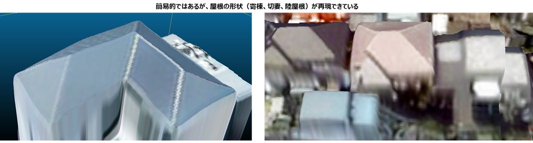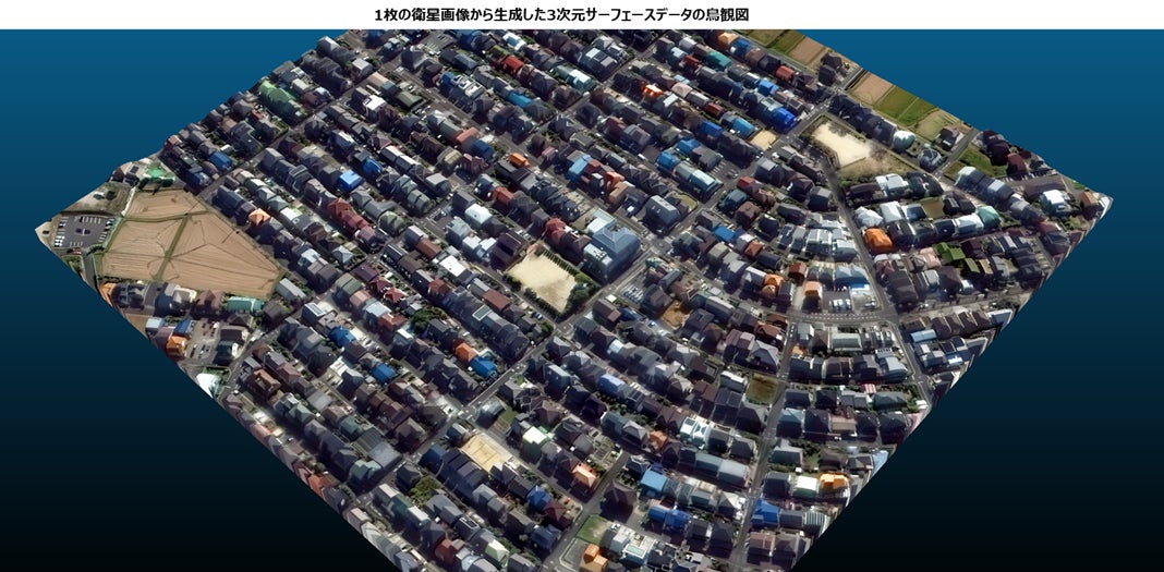 空中写真や衛星画像から3次元モデル(DSM)を生成するには、ステレオ画像からSfM/MVSによる計測が必要です。単眼深度推定は、1枚の単画像から撮影主点からの距離を推定し深度画像によって表現する手法ですが、衛星画像では対象物の鮮明でないことから実現は容易ではありません。そこで当社では、衛星画像の超解像・超超解像によって画像を極限まで鮮明化し、建物単位での単眼深度推定を可能にしました。さらに小範囲で推定した深度画像を接合・整合をはかることによって広域での単眼深度推定を実現しました。以下は、衛星画像から500m四方の領域から3次元モデルを生成した例になります。屋根の形状(寄棟、切妻、陸屋根)が再現できていることがわかります。