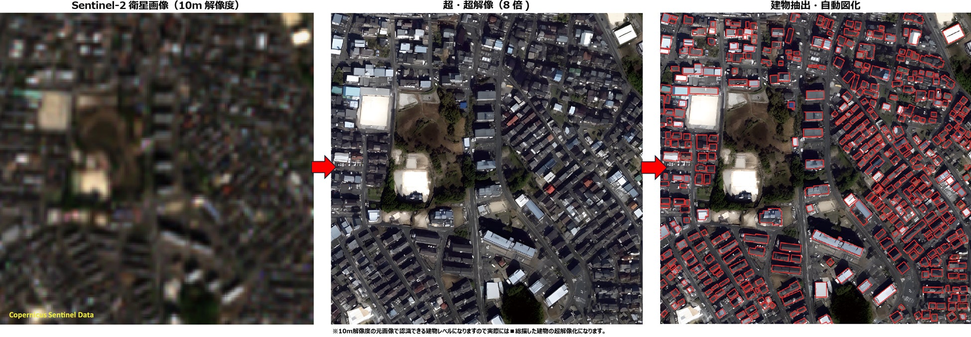 下の画像は、Sentinel-2(10m解像度)から建物のポリゴンデータを生成した例です。10m解像度では一般住宅の形状は再現できませんが、8倍の超解像化と総描、自動図化技術により、総描建物として再現可能になりました。