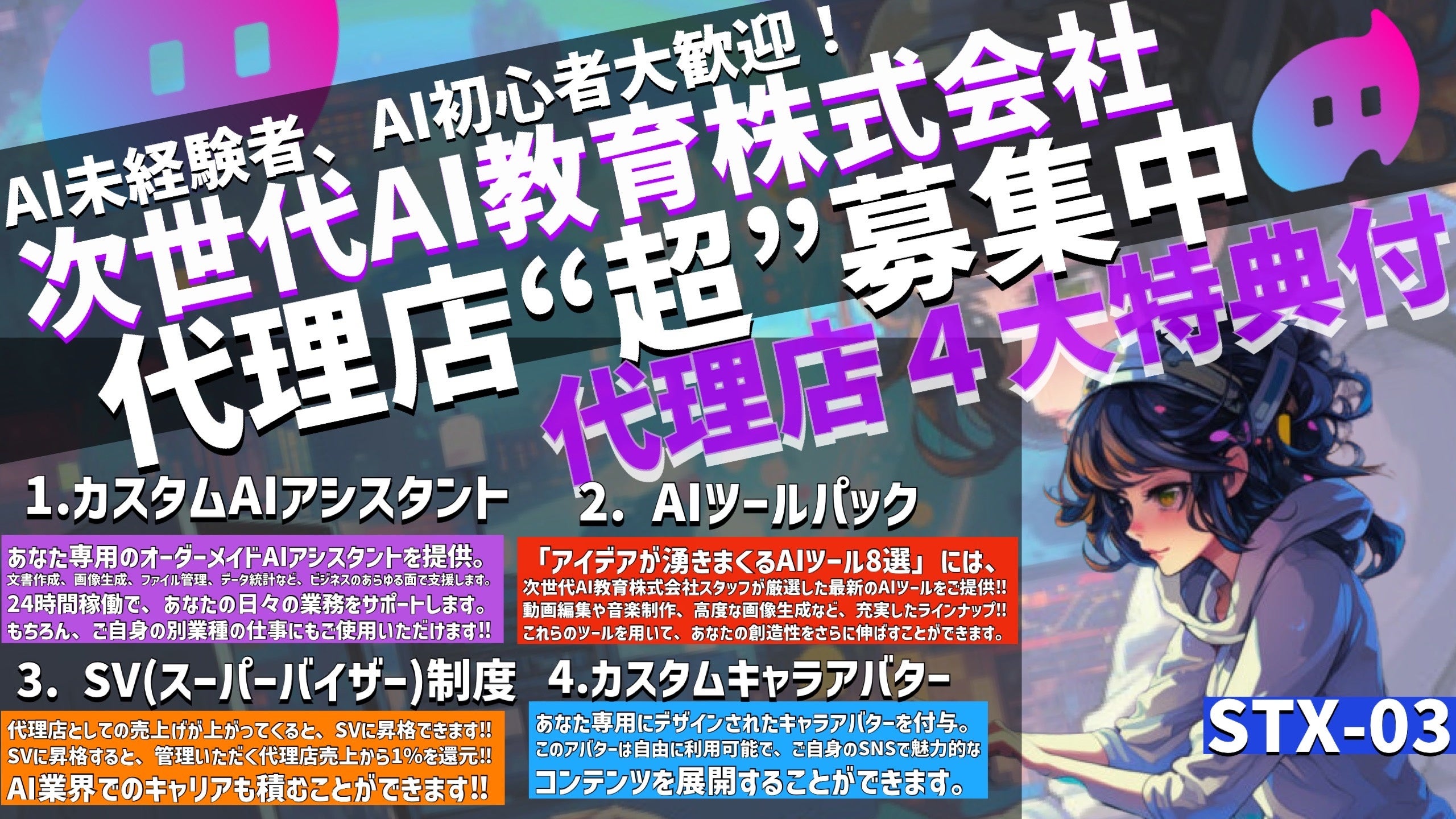 AIの進化と共に、あなたも成長し、業界での地位を築くことができるでしょう。もう一度言います。特別な能力は必要ありません。スキルも資格も必要ありません。学歴も過去も関係ありません。あなた自身の、あなたらしいアイデンティティさえあれば、次世代AI教育株式会社のAI達と共に、無限の可能性を探求できます。代理店加盟は公式InstagramのDMまたは問い合わせからご連絡ください。