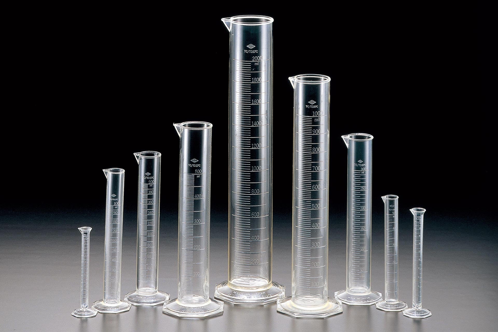 中でも、メスシリンダーは創業当時からの匠の技術が結集されたものです。プラスチックのためガラスに比べて割れにくく、液体を注いでも軽い力で持ち上げられます。