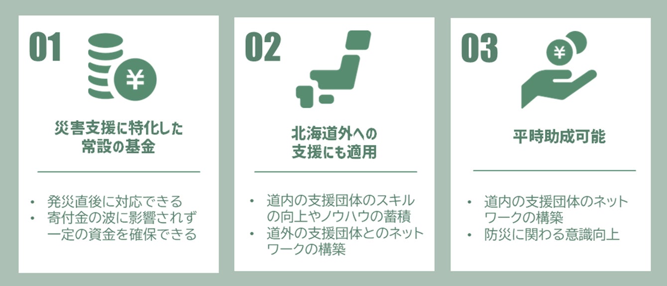 北海道災害復興支援基金は、NPOによる平時・災害時の長期的な支援活動を保障することによって、北海道の持続的な災害復興を支援することを目的に、北海道NPOファンドにより2020年に造成された基金です。