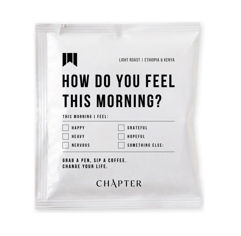 1冊のノートと、1杯のコーヒー。どちらも、“手を動かすこと”から始まる、自分との静かな対話です。朝の静かな時間に寄り添うコーヒーとして、吉田ちか氏の『優しくて飲みやすいlight roast』というイメージを受けて「BARISTA MAP Coffee Roasters」が焙煎、ブレンドし“自分と向き合う”特別な一杯「CHAPTERブレンド」が完成しました。パッケージにも自分と向き合う、ジャーナリングのきっかけになるような問いかけが書かれていて、コーヒーとジャーナリングのコラボレーションが実現しています。