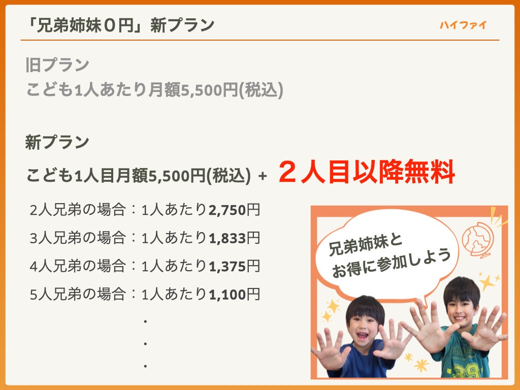 一般的に子どもの数は増えれば増えるほど家計の出費は増えるため、経済的な不安を理由に子どもをつくらない家庭が増えています。少しでも経済的負担を減らし、子どもを産みたいと思える人を増やすため、すでに兄弟姉妹がいる家庭のこどもたちの可能性を広げるため、この度、新プランを開始しました。オンラインを通じて場所格差を無くし、兄弟姉妹0円新プランを通じて、所得格差なく教育機会を提供できるよう努めてまいります。