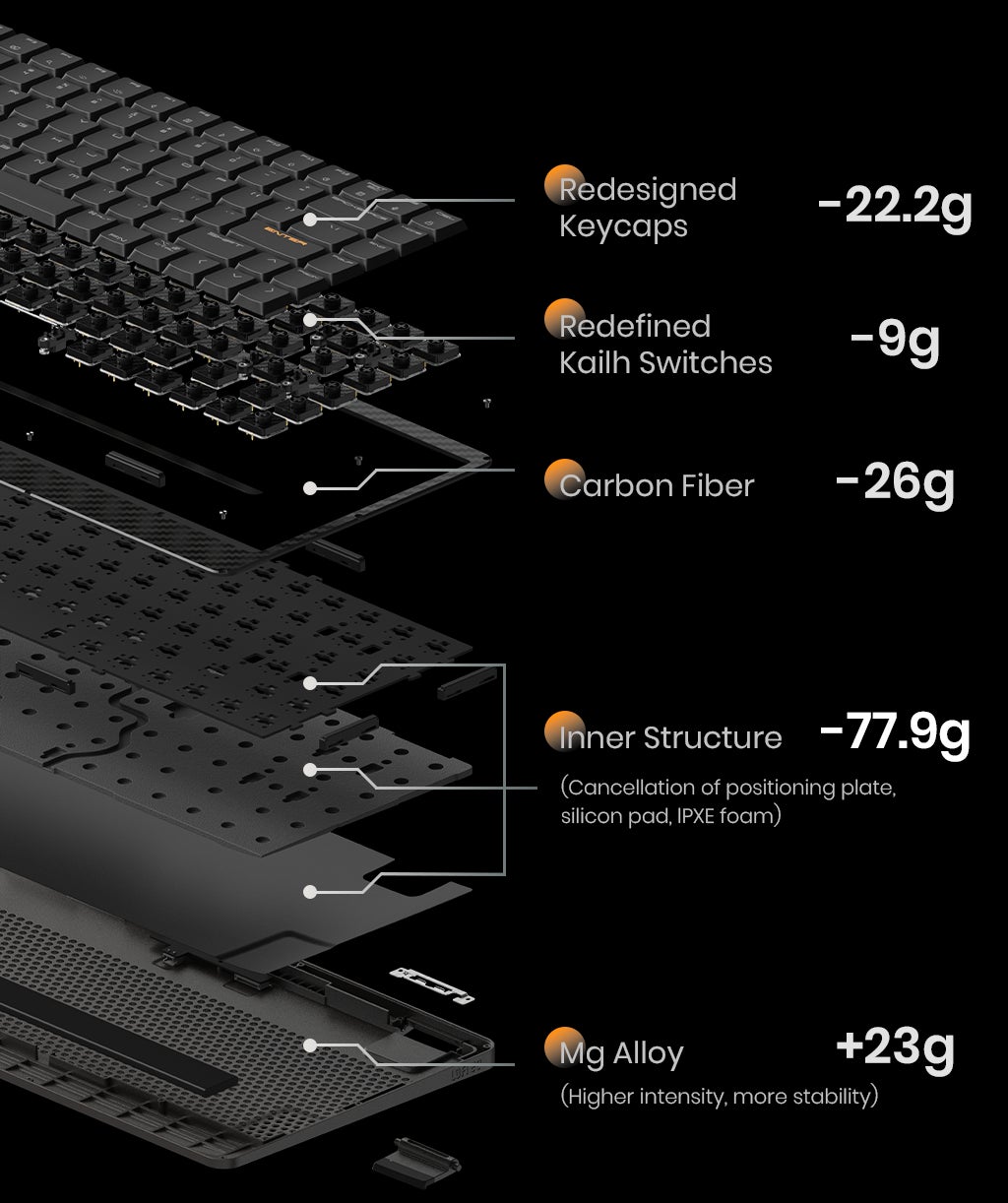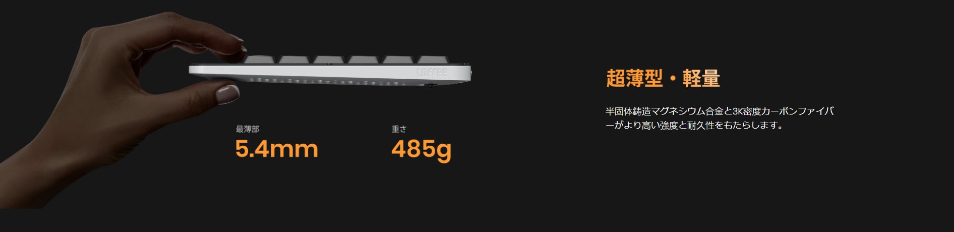 「Edge」は、超薄型・軽量を実現しました。キースイッチプレートを廃し、徹底したスリム化を進めた結果、本体の最薄部は僅か5.4mmとなりました。また、本体の重量も徹底的に軽量化され、わずか485gです。メカニカルキースイッチを採用した75%レイアウトのキーボードとしては、最薄・最軽量クラスといえます。マグネシウム合金製のボディとカーボンファイバー製のフレームを採用しているため、強度に関する心配もありません。