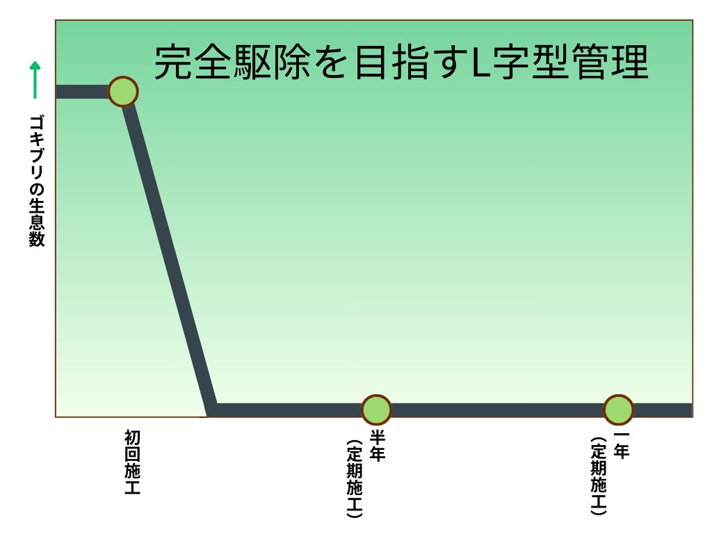 株式会社クリーンライフのゴキブリ駆除は、「店舗内部での繁殖を完全にゼロにすること」を目標としています。同社は半年に一度、計年2回の薬剤散布と徹底した点検を行い、冷蔵庫や調理台の下、モーター室などゴキブリの潜伏箇所を重点的に処理します。駆除成功の基準として、外部から偶然侵入した個体はカウントせず、内部での繁殖が確認されない場合に駆除成功と見なします。