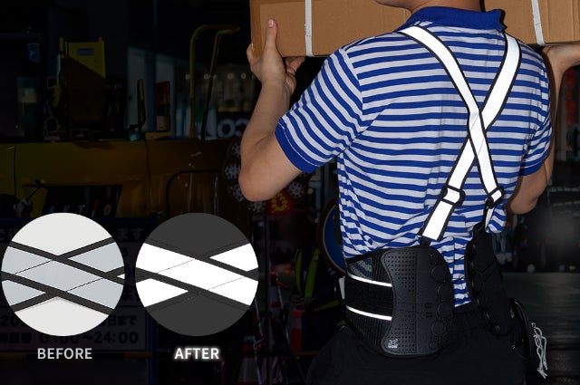 夜間作業時の視認性向上のため、ベルト本体と専用サスペンダーに光を反射する素材を採用しています。これにより、夜間における安全性にも貢献いたします。