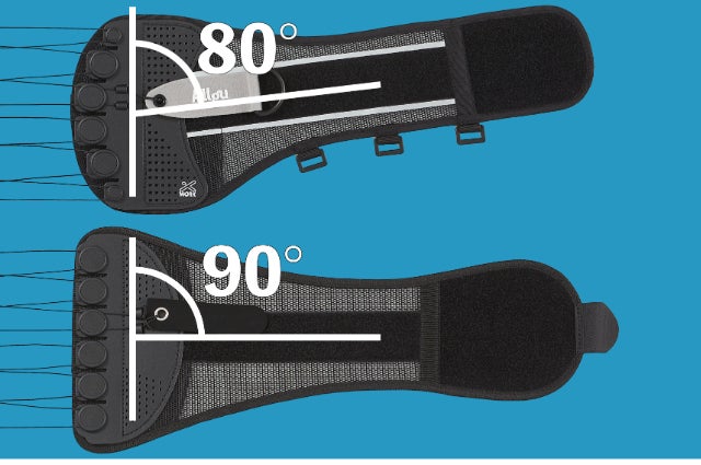 ベルト本体と動滑車プレートを80度の角度で配置することで体型に沿った装着が可能になり、力を逃す事なく引き締める事が可能です。