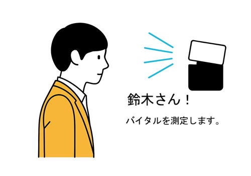 顔認証システムにより個人を識別し、お名前をお呼びして、バイタルサインの測定を開始します。測定結果を音声とスマートフォン、タブレットに数値で表示します。