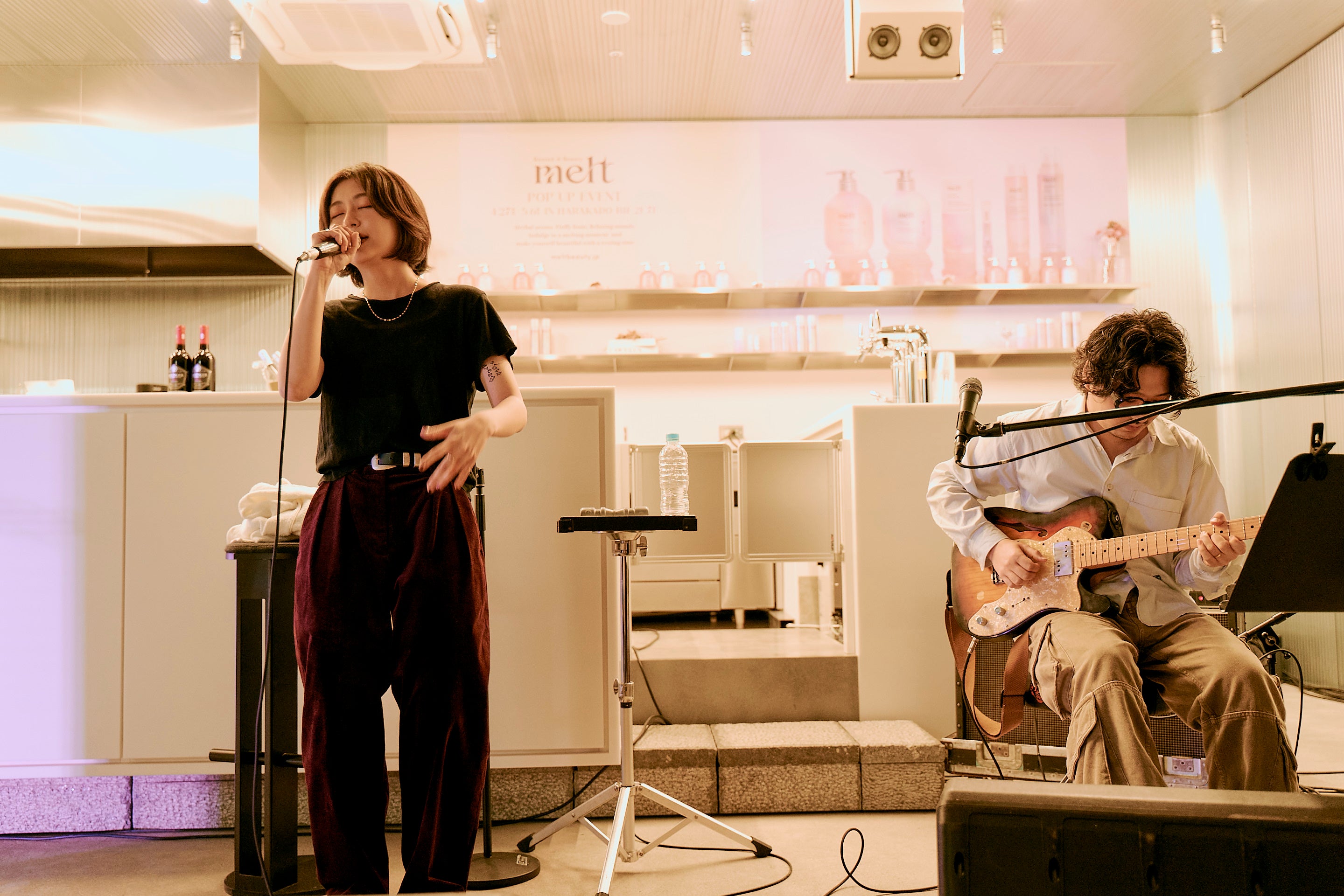 外も暗くなり始め会場の雰囲気も高まる中、鈴木真海子さんが登場、会場からは大きな拍手が起こりました。鈴木さんの「『melt』発売おめでとうございます!」との祝福の言葉のあとに、「『melt』の曲をやったんです、私が」と、「melt」タイアップ楽曲「kimochi」を披露。会場は歌声に一気に惹き込まれていきます。その他「untitled」、「judenchu」、「どっかの土曜日」、「金木犀」を披露いただきました。「melt」の世界観と、鈴木さんの歌声がマッチし、心地よくとろけるような「melt」初のポップアップのスタートにふさわしい夜となりました。
