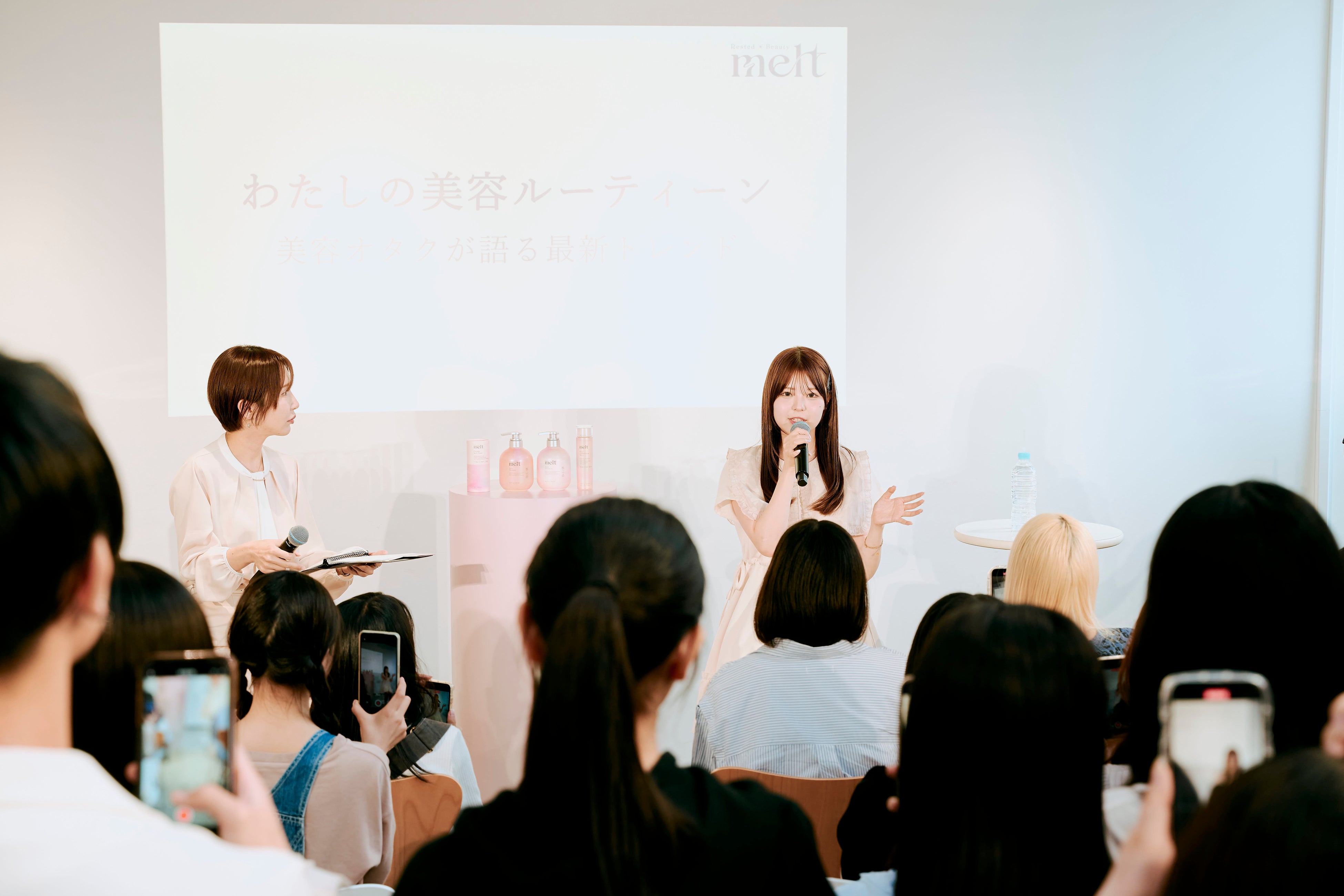 美容オタクな折田さんの注目の美容トレンドは「セルフケア」。おうちで自分の美容と向き合う時間をつくって、自己肯定感を上げていくことが大事とお話しされました。そんな折田さんにとって「melt」は、疲れている時やお風呂時間で癒されたい時に自分の美容と向き合う時間をつくってくれる、「まさにトレンドにのっている商品」と力説頂きました。特に「香りがどストライク!」など、衣装も「melt」を意識したピンク色で、惜しみなく「melt」愛を披露して下さいました。会場に集まったファンとの掛け合いも交えながら、笑顔あふれる一体感のある楽しい時間になりました。