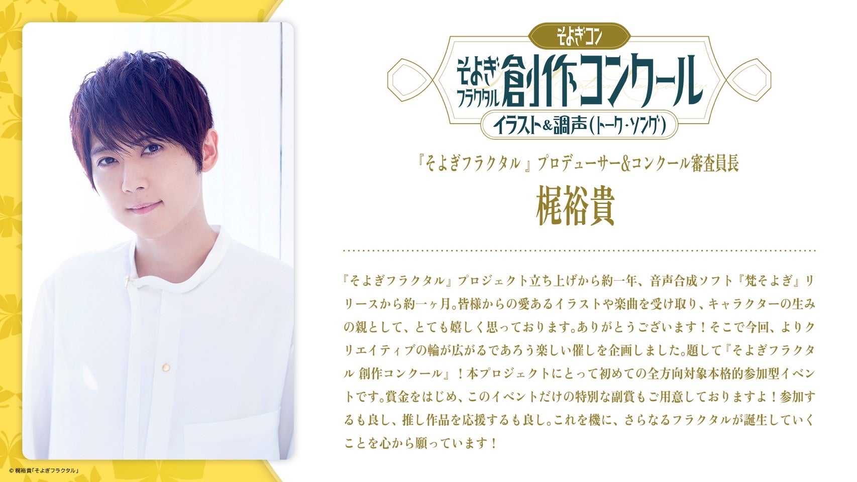 音声合成ソフトウェア『梵そよぎ』発売記念 創作コンクール「そよぎコン」では、イラスト、トーク調声、ボイス調声の3部門で作品を募集。キャラクター『梵そよぎ』のイラストを描くイラスト部門、 音声合成ソフトウェア『梵そよぎ』を使ってオリジナルトークを制作するトーク調声部門、オリジナル楽曲を制作するソング調声部門の3部門それぞれに応募された作品を、「そよぎフラクタル」プロデューサーである梶裕貴自らが審査員長となって、全応募作品を審査します。