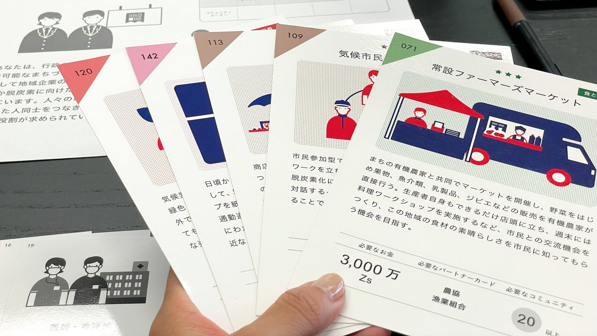 参加者は一つの町に住む仲間として、3種類のカード、「プロジェクト」「人材」「資金」を使用して、実際に起こりうる気候危機を予防し、町のCO2排出量を削減するゲームに参加します。