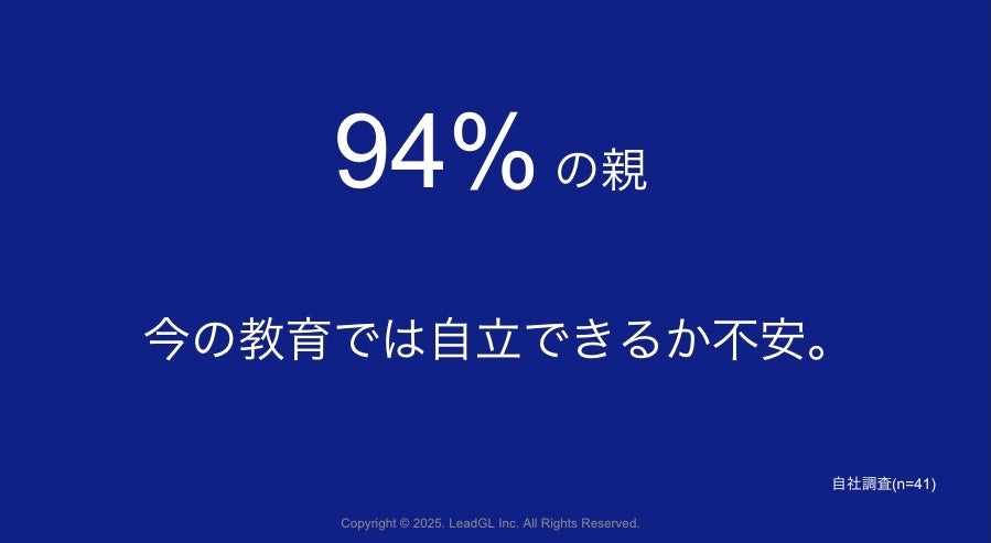 自社調査では、95%の親が「子供にとって大事なことは自立すること」と思っている反面、94%の親が「今の教育では自立できるか不安」と答えている。特に、経済的な自立の前に必要な精神的な自立が望まれている。