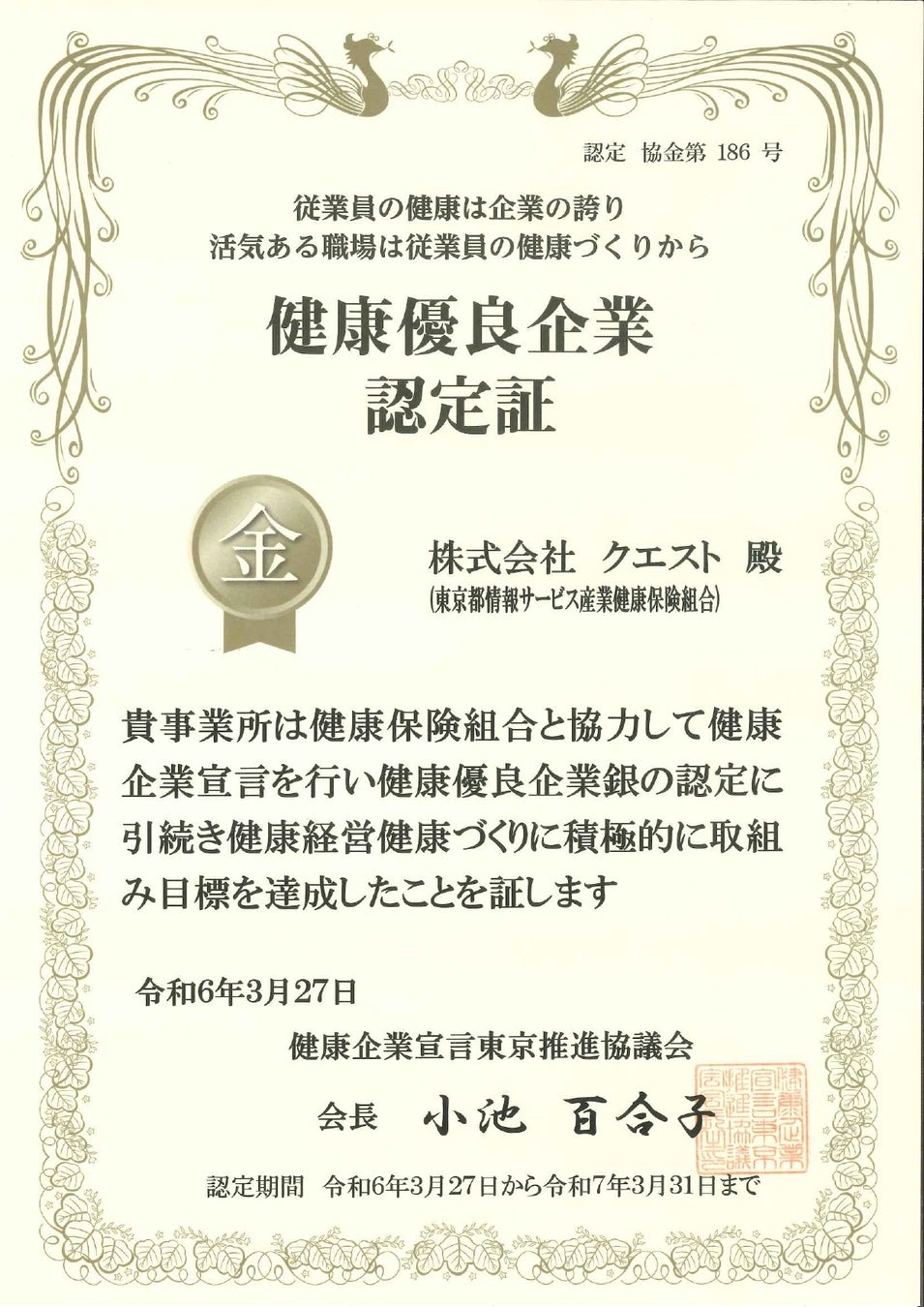 株式会社クエスト(本社:東京都港区、代表取締役 社長執行役員:岡明男、以下 クエスト)は、健康経営に対する積極的な取り組みが評価され、2024年3月に健康優良企業として認定される「金の認定」を取得しました。 2024年4月時点で、TJK(東京都情報サービス産業健康保険組合)加入事業所およそ1600社のうち、当社を含めて20社が認定企業となっています。