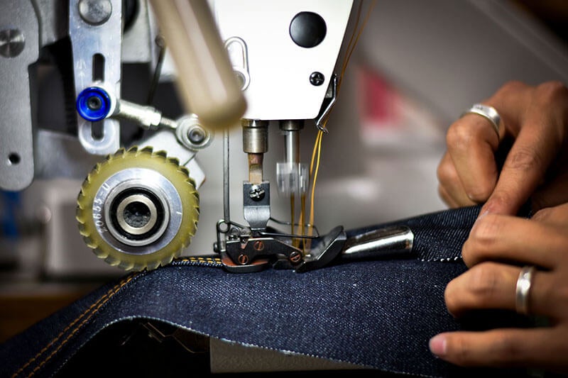 職人たちが青空縫製工場でジーンズ・デニムスカートを作ります。製造される工程をご覧いただけ、出来立てのジーンズ・デニムスカートをお買い求めできます。もちろんフィッティング、裾上げ、腰回りの調整といった最終調整もその場で可能です。