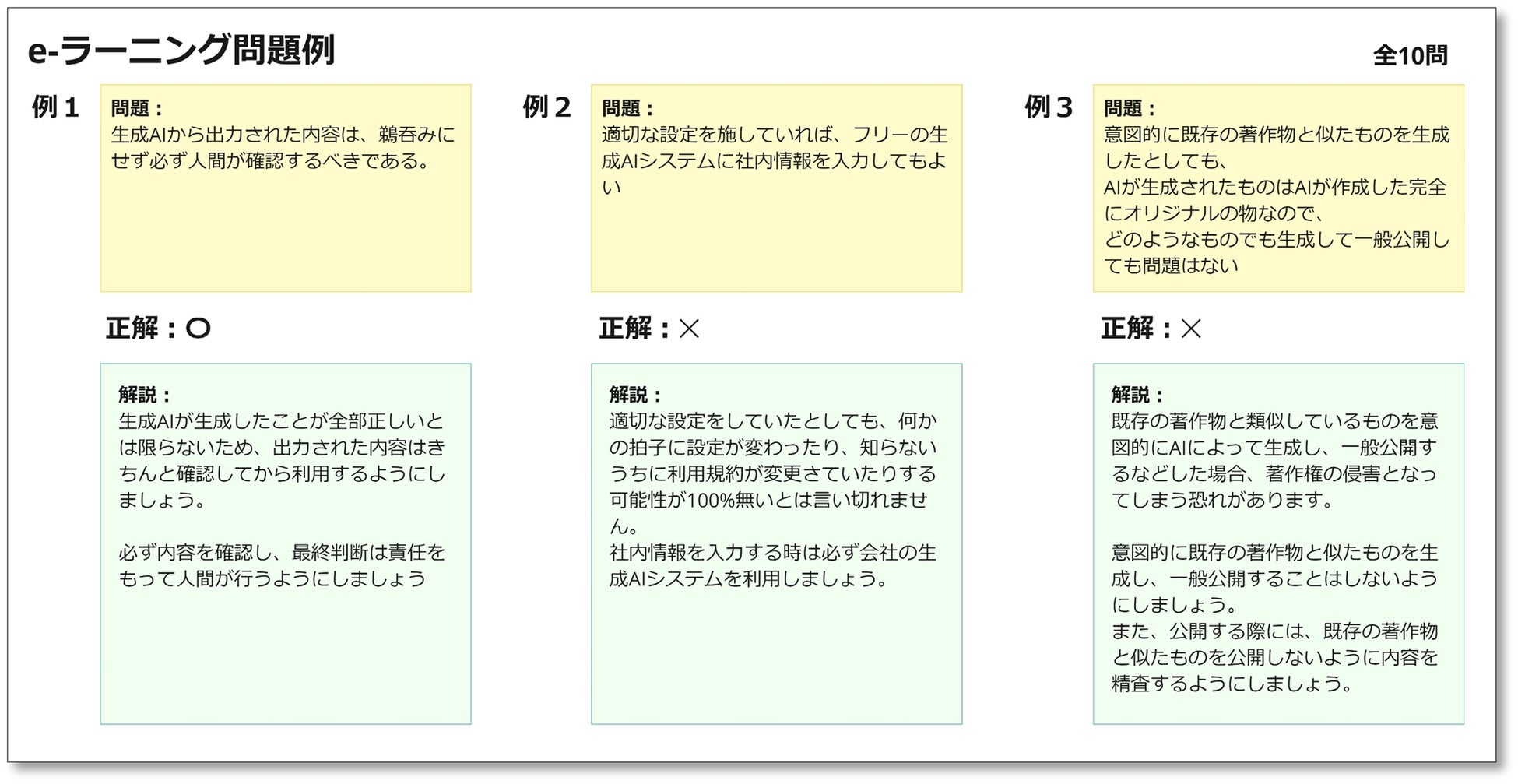 e-ラーニングでは、対話型生成AIシステムを業務で活用するための基礎知識や使用上の注意点などについて学習し、適切な利用方法について教育を行っています。