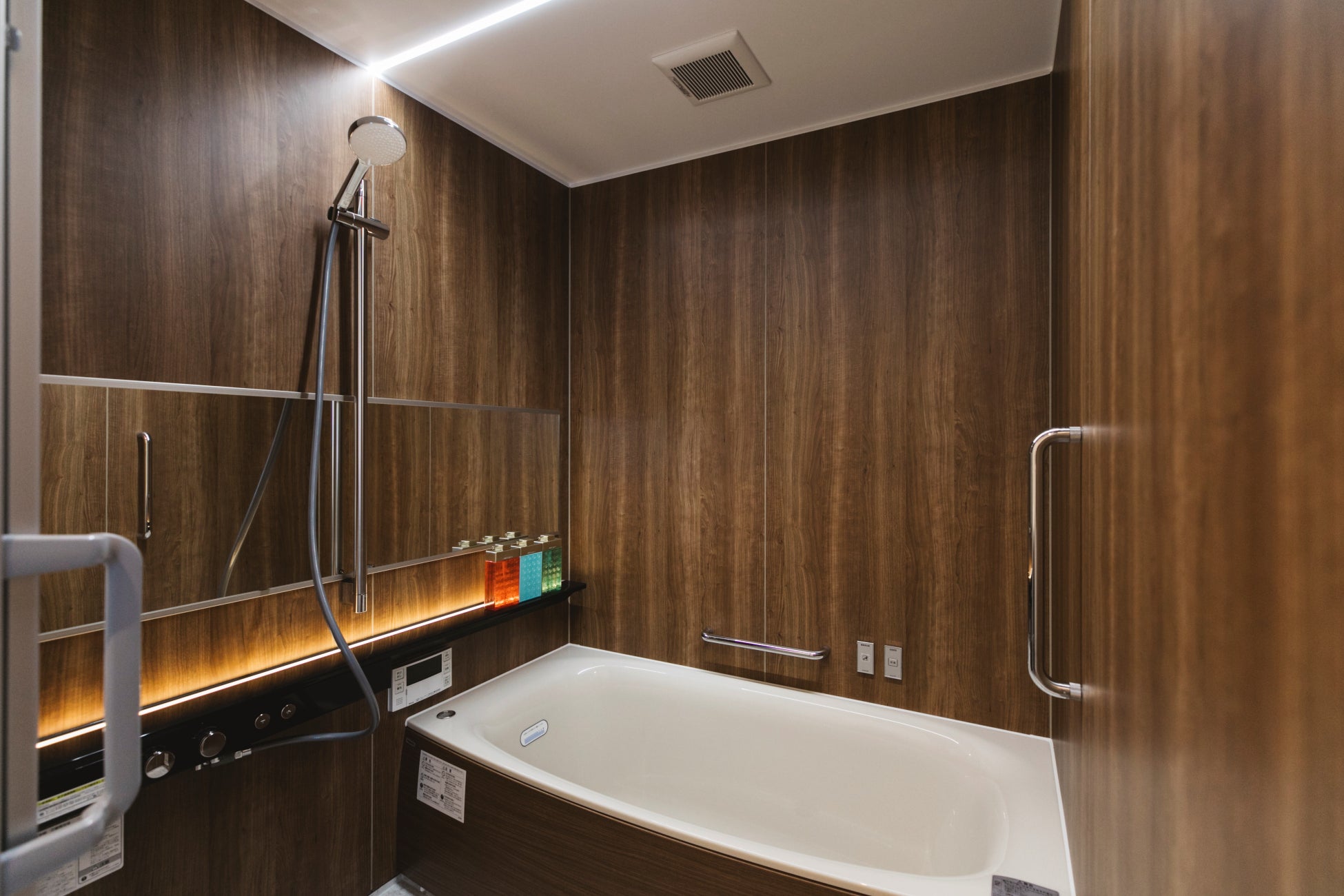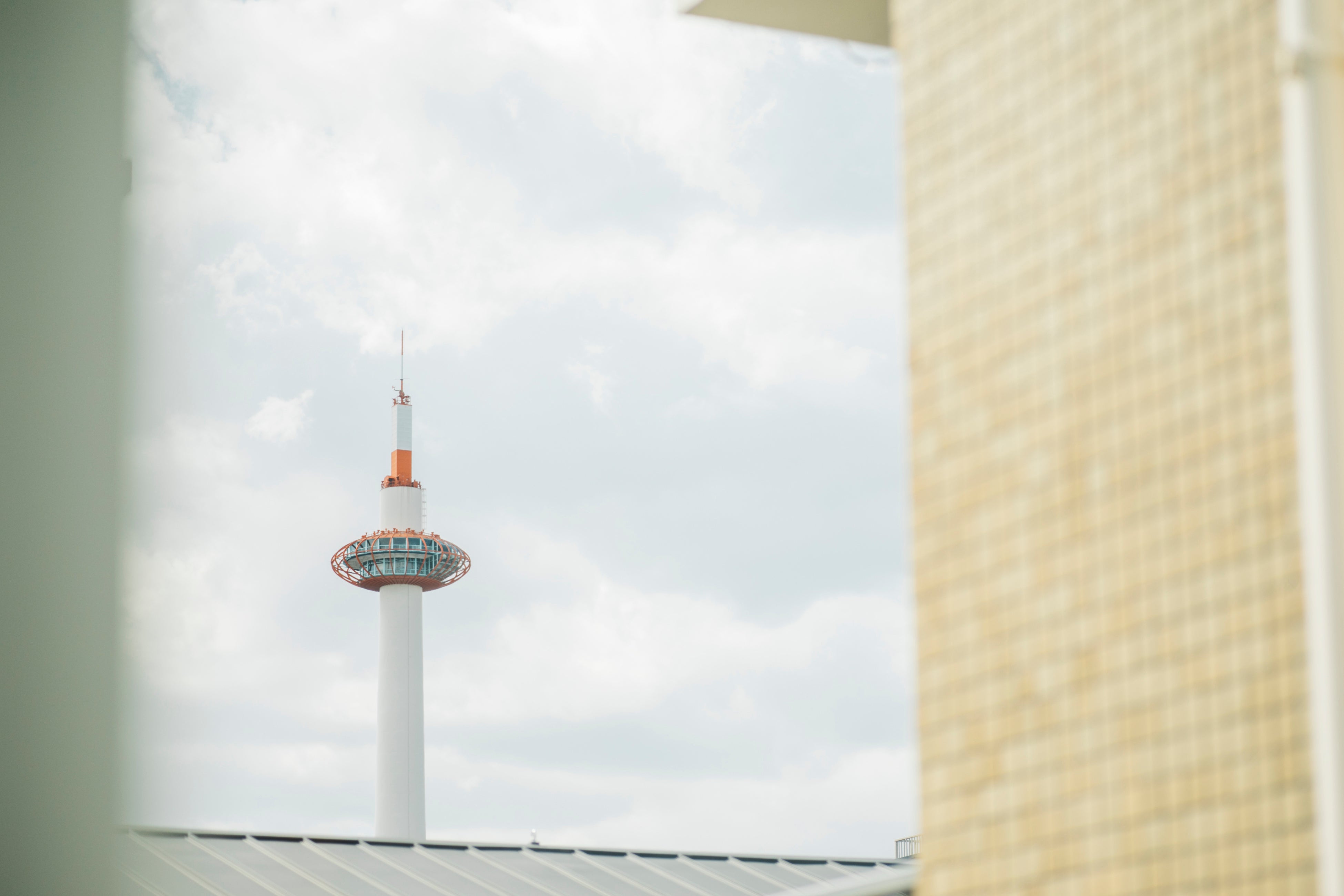 ● 客室には電動リクライニングベットに洗い場のついたバスルーム。3階からは京都タワーが見られる。