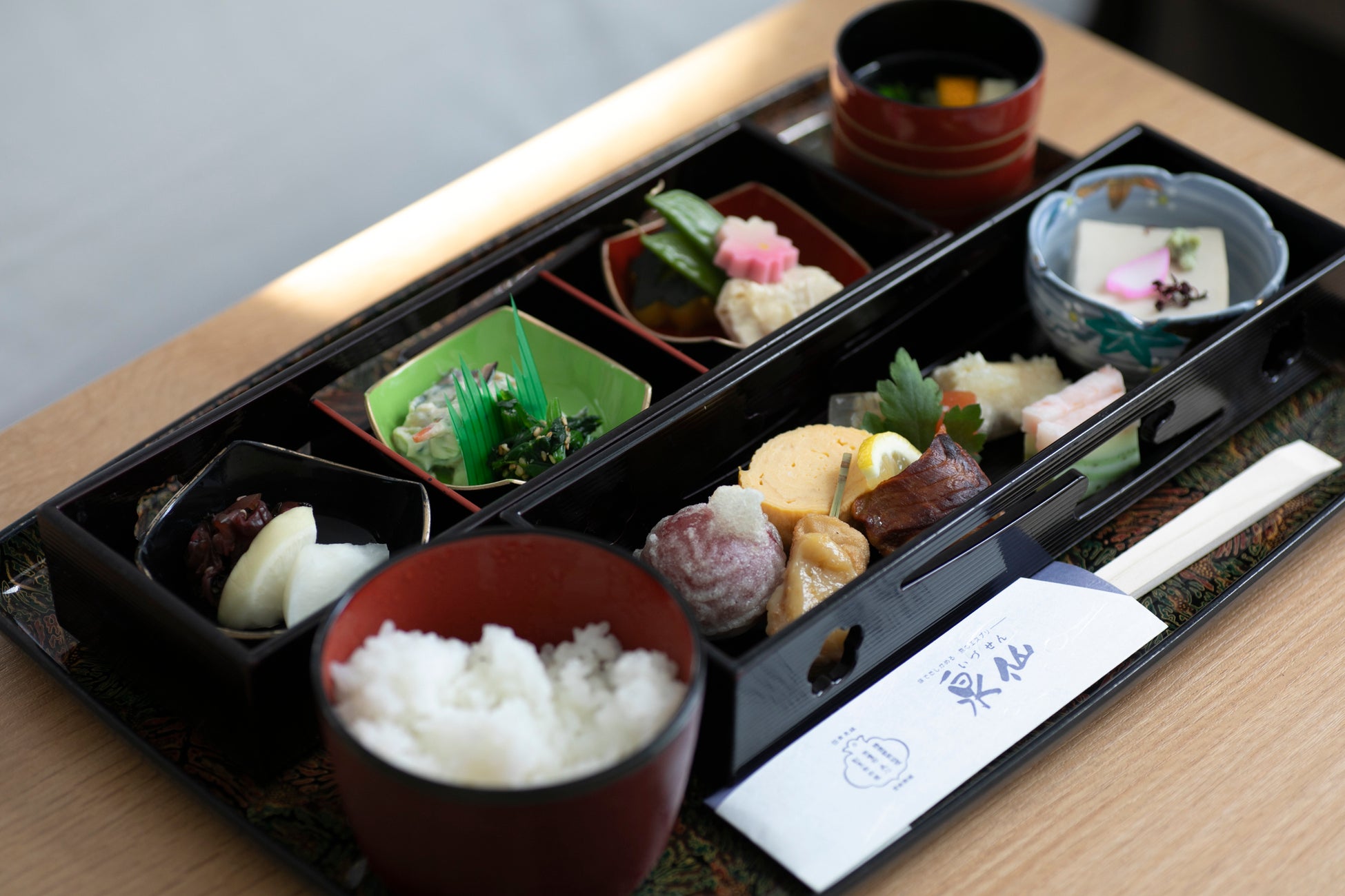 京都駅周辺の町家に京都を感じる美しいお料理の数々をご提供する高級割烹仕出しで有名な「泉仙」様の朝食をご提供。お留守番中の愛犬と客室でゆっくりされたいお客様のためにご夕食も泉仙様の折詰め弁当や点心もご用意。