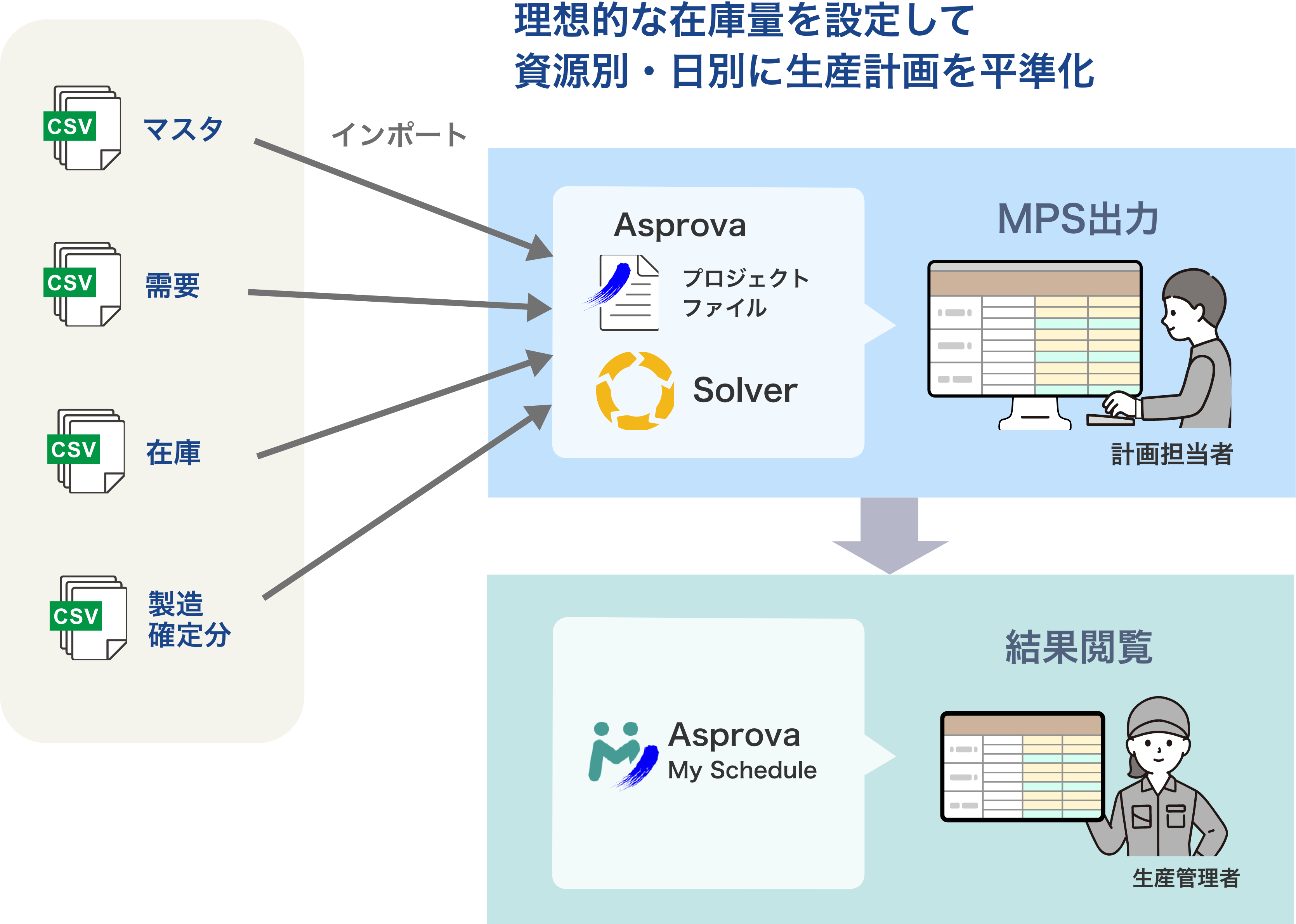 「Asprova Auto MPS」は弊社独自に開発した生産計画立案用のAIであるSolverを利用し、需要の波動に合わせて、100万通り以上の計画案の中から最適な生産計画を自動で立案することができます。これにより、企業は納期遵守と人員設備負荷平準化の両立が実現でき、不要な残業や過剰な設備負荷も抑えることができるので、生産コストとキャッシュフローの改善が期待できます。また、日次バケット、ライン負荷分散計画業務にフォーカスされたパッケージ製品のため、短期間での導入が可能です。これまで6か月以上を要することもあった製品導入時の工数を気にすることなく、迅速で精度の高い基準生産計画立案ができ、工場能力の最大限活用に繋がります。