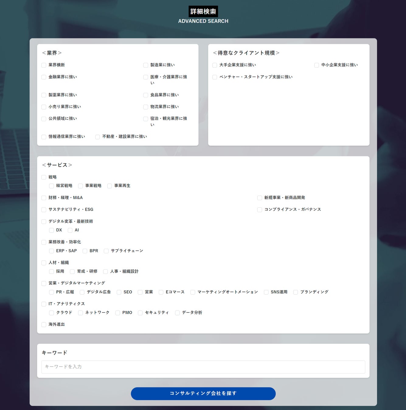 CONSUL SEARCH では、150社以上のコンサルティング会社の情報を掲載しており、「業界」「サービス」「得意な事業規模」などの条件から検索することが可能です。これにより、課題を抱える事業者は、自社のニーズに合致したコンサルティング会社を効率的に探すことができます。
