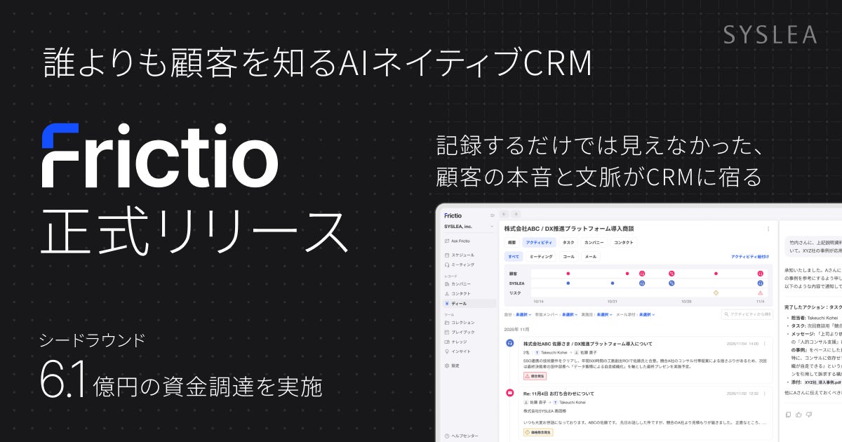 株式会社SYSLEA(本社:東京都品川区、代表取締役CEO:大橋 勇輔、以下:当社)は、AIネイティブCRM『Frictio(フリクシオ)』の正式提供を開始いたしました。Frictioは、営業活動における顧客との対話から、商談のコンテキスト(文脈)をAIが自動で取得・構造化し、組織のデータ蓄積から実行支援までを一気通貫で自動化するCRMです。