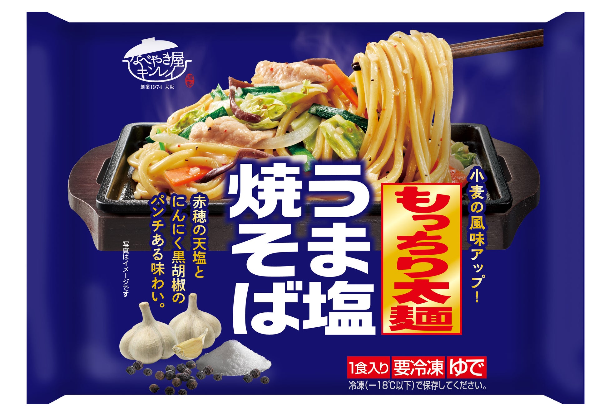 もっちりとした太麺に、赤穂の天塩とにんにく、黒胡椒をきかせたパンチのある味わいの焼そば。鉄鍋で炒めた野菜など7種類の具材を盛り付けました。