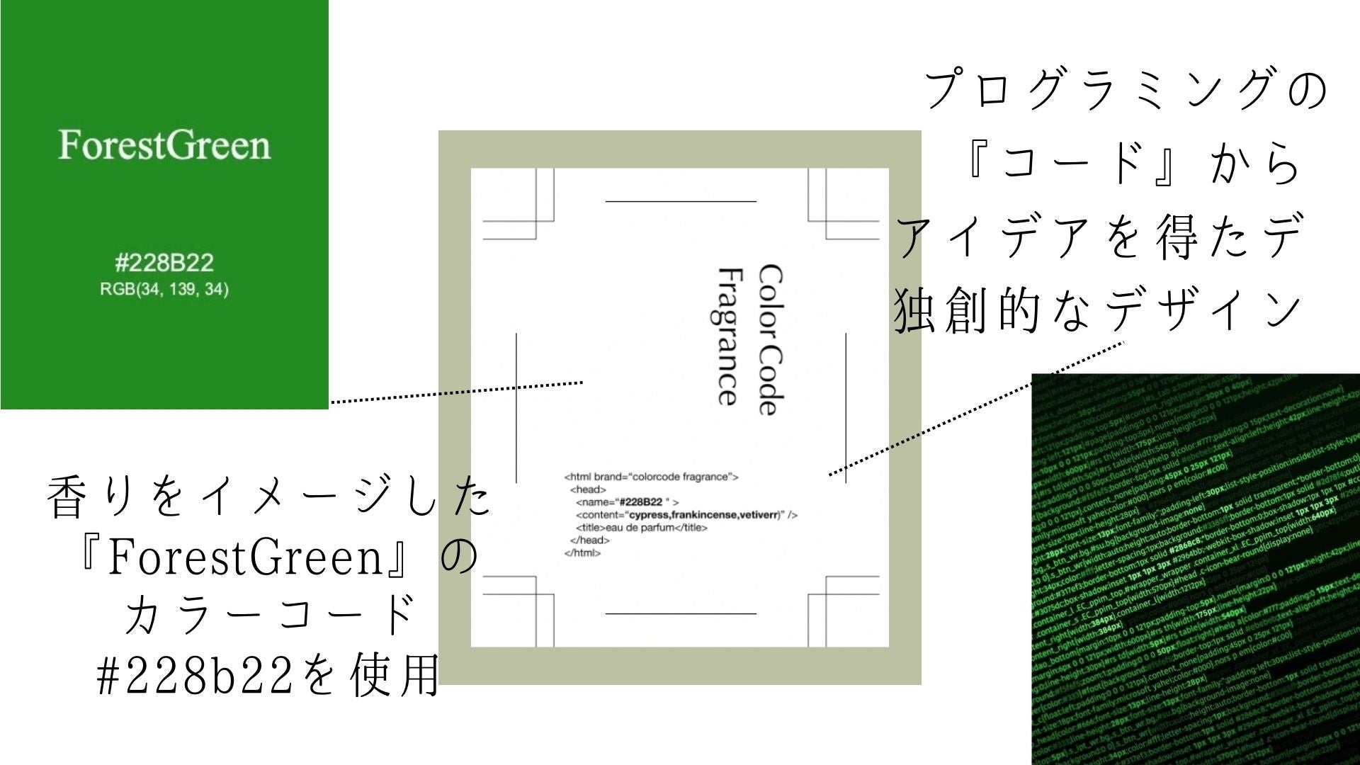 ColorCode Fragranceは、忙しい社会人のために、日常生活の中で自然を感じられるような特別な香りを提供することを目指しています。森林の香りをテーマにした「#228B22(フォレストグリーン)」は、都会生活の中での小さな逃避として、また心労を感じる瞬間に心を落ち着ける手助けとなることを期待しています。私たちの日々の生活に寄り添い、休息を提供するこの香水が、多くの方々の支持を得られることを願っています。