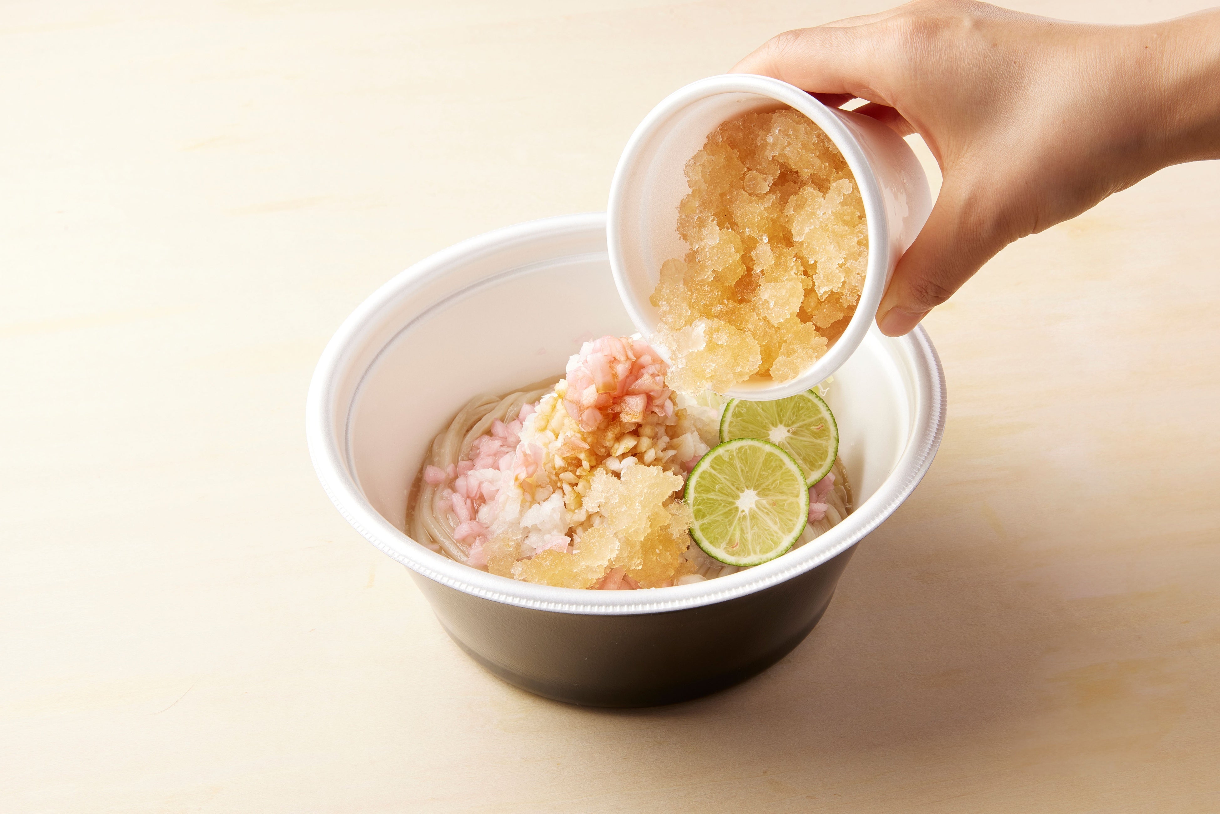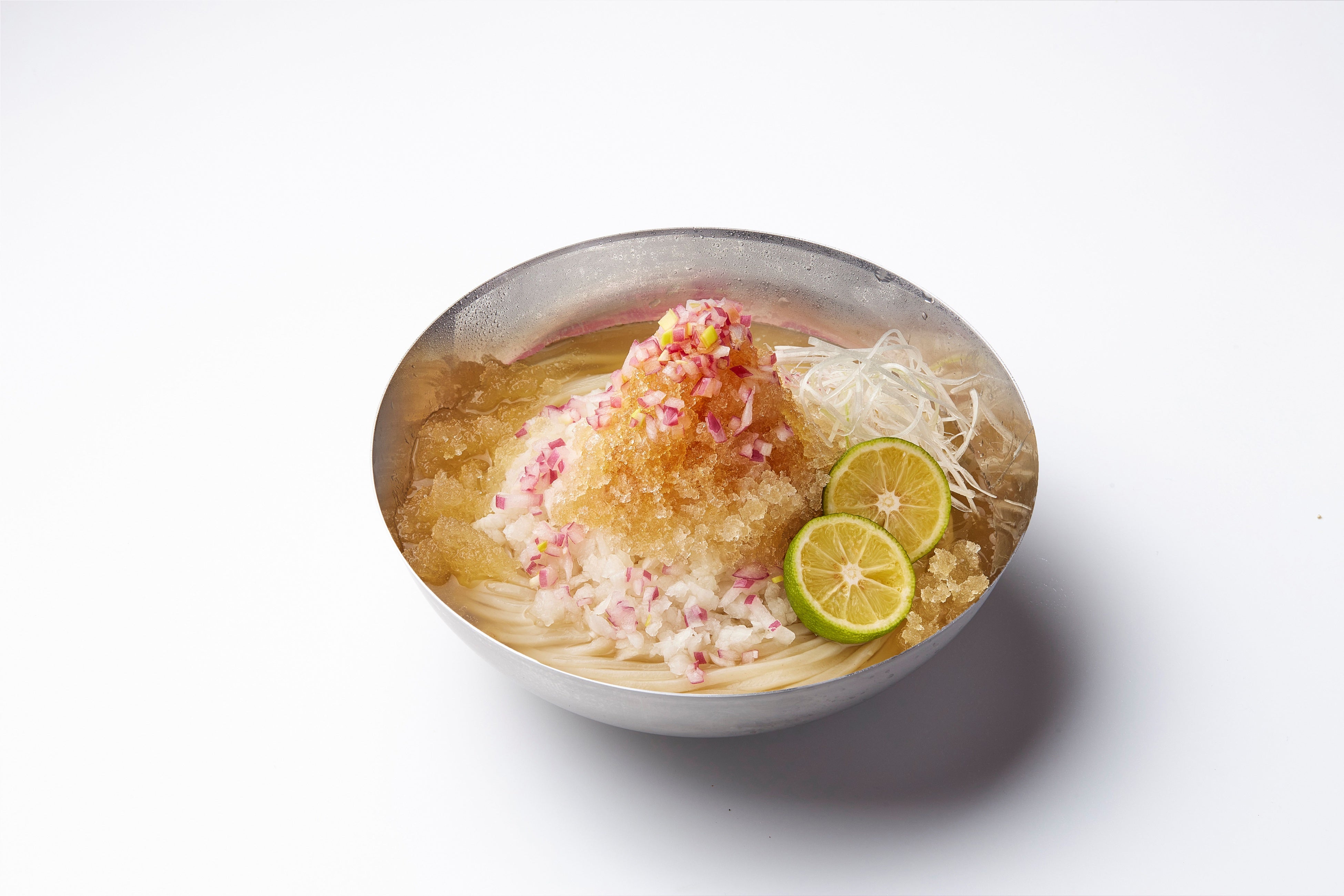 シャーベット状のだし氷をふんわりと盛付け、紫玉ねぎの酢漬け、徳島県産のすだち、白髪ねぎ、そして最後に少し甘めの醤油ダレをかけていくことでさっぱり、かつコクのある味に仕上がります。