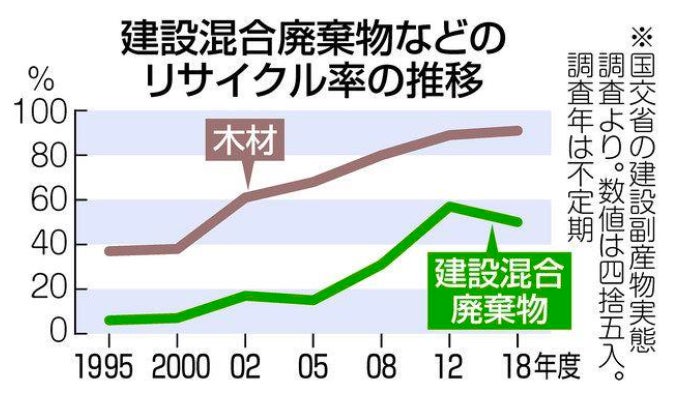 これまでの様々な建設資材でも、まだまだリサイクル出来るものがあります。国土交通省の調査によると、建設現場から出たごみ全体のリサイクル率は 9 割を超えますが、建材を含む「建設混合廃棄物」は 5 割程度になっています。廃プラスチックや ガラス、木くずなどが交ざり、分別が難しいことが原因です。国交省の建設副産物実態調査(2018年度)によると、建設混合廃棄物のリサイクル率は50.4%で、木材の 91.7%、コンクリート塊の 99.3%に比べ大幅に低いことがわかります。建設混合廃棄物の排出量はごみの約3%を占め、年228 万トンに上ります。それらはリサイクルされないので、4 割弱の84 万トンが産廃の最終処分場に埋め立てられています。このままのペースだと、全国の産廃の最終処分場はあと17年で満杯となってしまいます。首都圏に至っては、5年半で満杯になってしまうペースです。国交省の担当者は「建設混合廃棄物の実態を調べ、排出量そのものを減らす方策を検討している」としていますが、具体策は発表されていない状況です。
