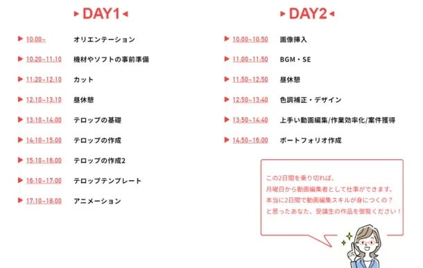 講座は2日間で動画編集ができるようになる実践的なカリキュラム内容となっています。最後には、受講者の実績となるポートフォリオとして自己紹介動画を作成するので、月曜日から営業活動が可能です。