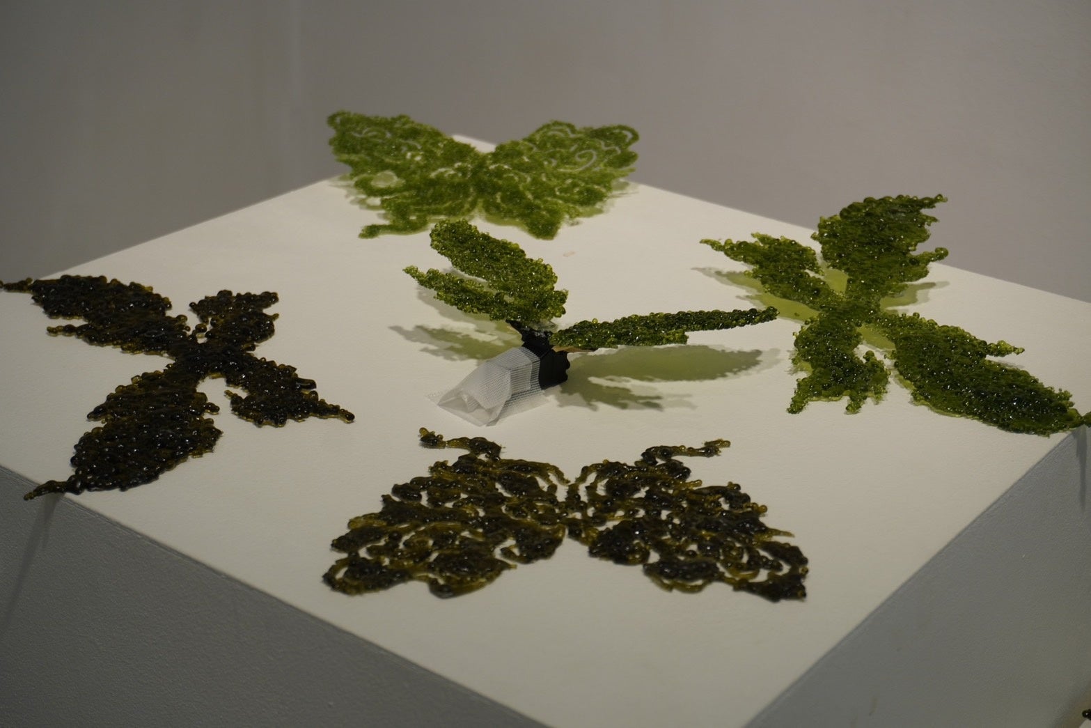本プロジェクトの参加者の一人である康鎔涵さんは「蝶」をテーマに、ワインボトルを細かく砕いて、様々な色・形の蝶で、展示会場を華やかに演出しました。