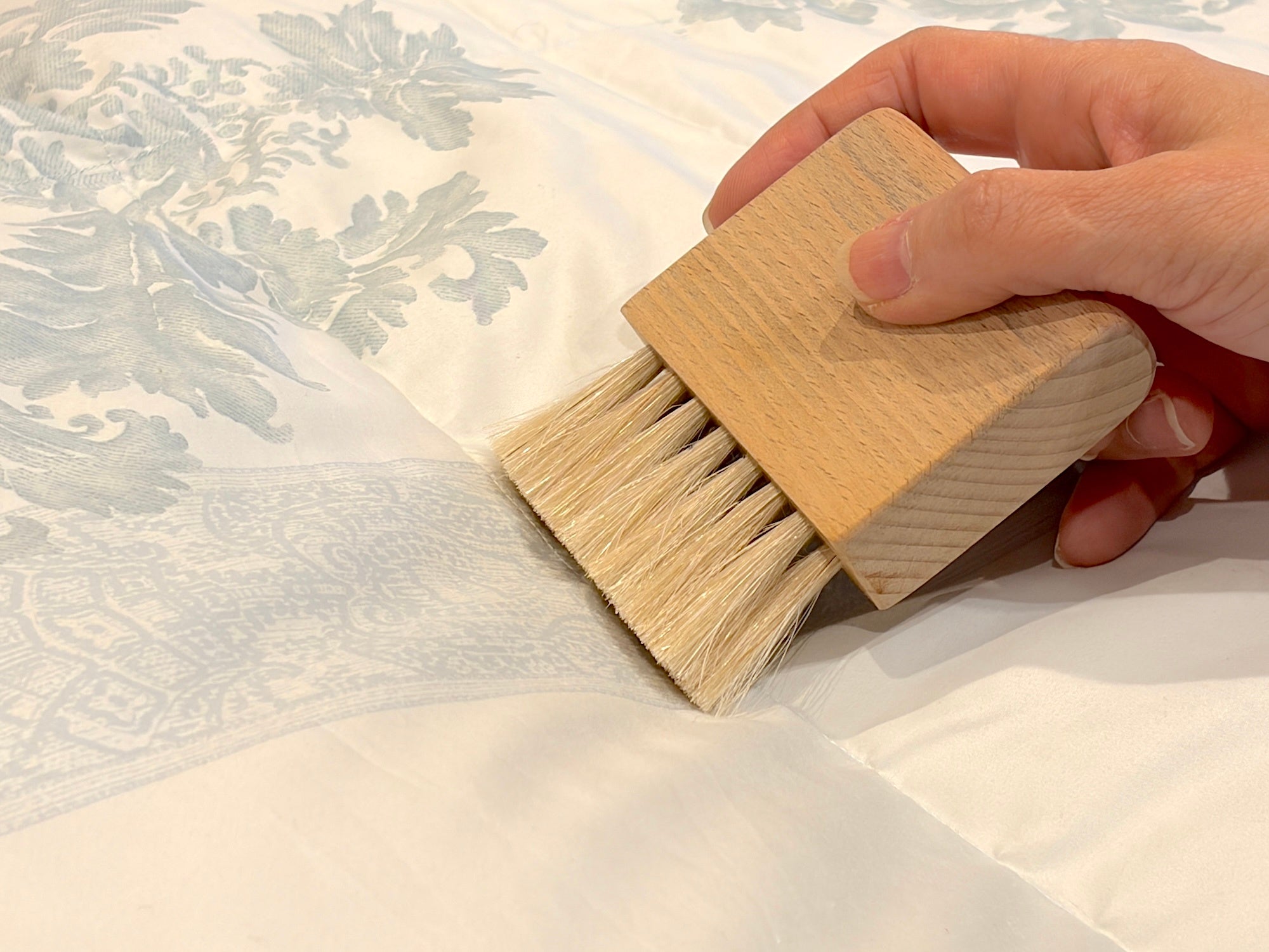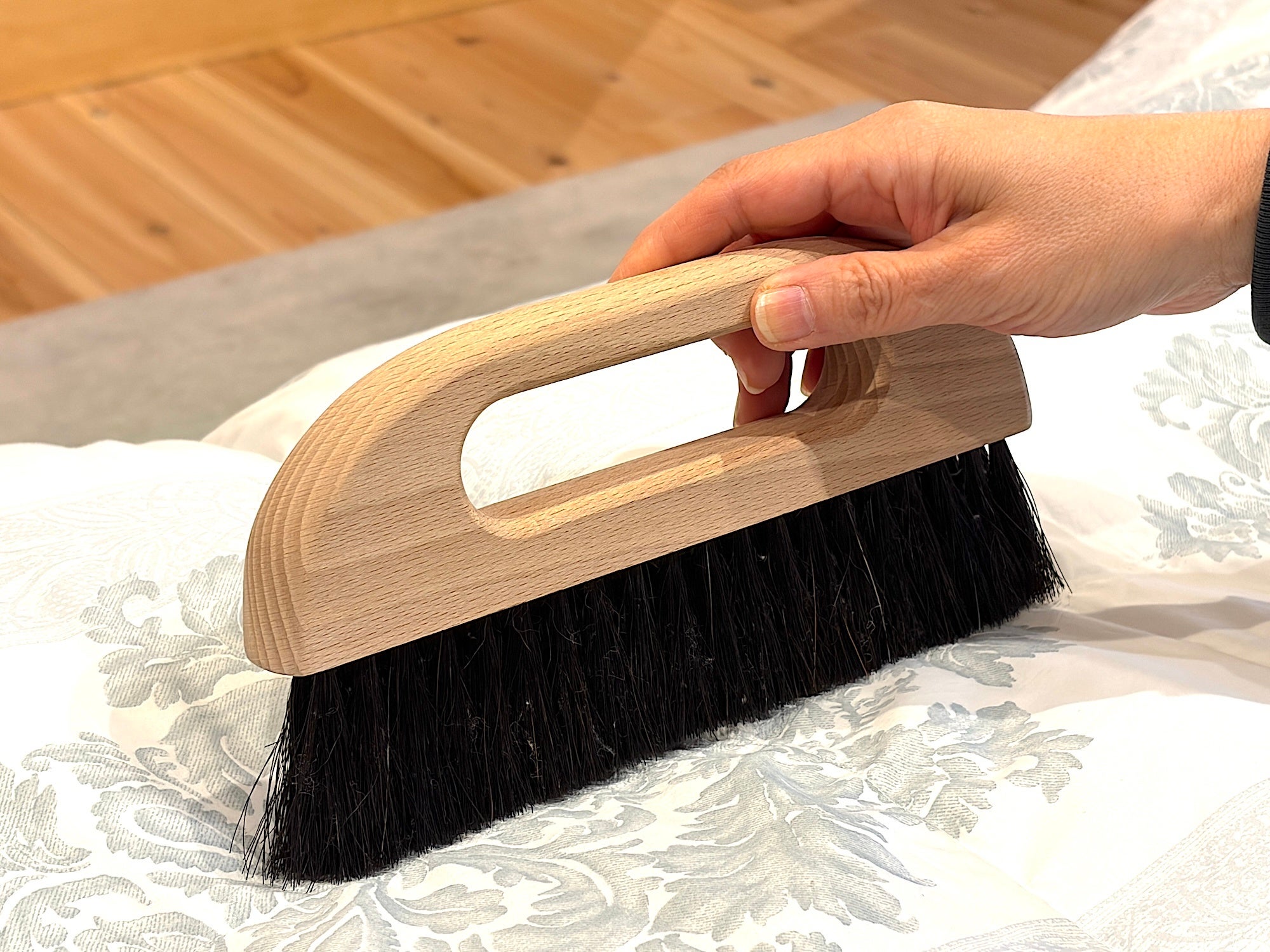 「布団のホテル™」では羽毛布団の仕上がり品質を高めるため、縫い目に入り込んだホコリをブラシを使い分け丁寧に除去しています。布団の状態に応じて2つのブラシを使い分けることで、生地に負担をかけずに汚れを取り除く細やかな作業を行っています。