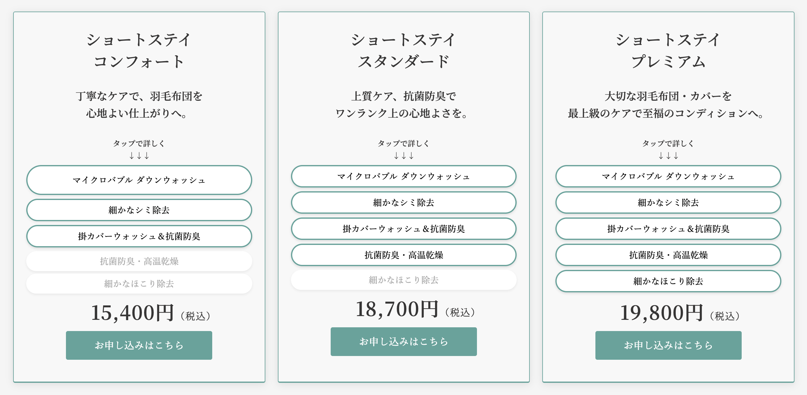 「布団のホテル™︎」ショートステイは羽毛布団の洗浄に特化。洗浄前に縫い目のホコリ除去、シミや汚れの除去をおこない、マイクロバブル水での個別洗浄、洗浄後の抗菌防臭加工を施します。コンフォート15,400円(税込)から。