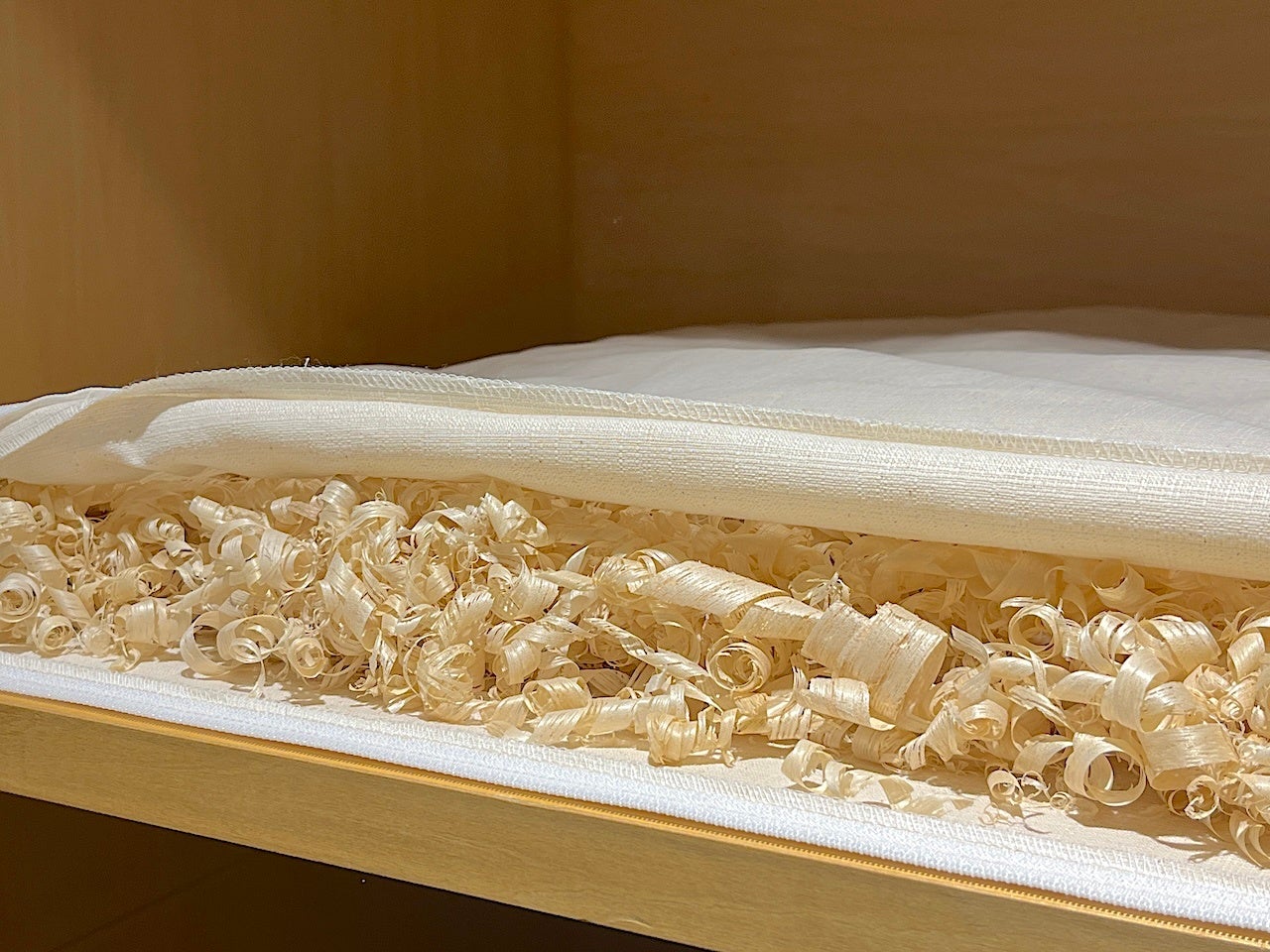 ロングステイでは、洗浄後の羽毛布団を個別の部屋で、調質性に優れた桐を使用したオリジナルシートの上に抗菌ガーゼに包んでお預かりし、月に一度の高温エアーによる湿度調整などのケアも行います。