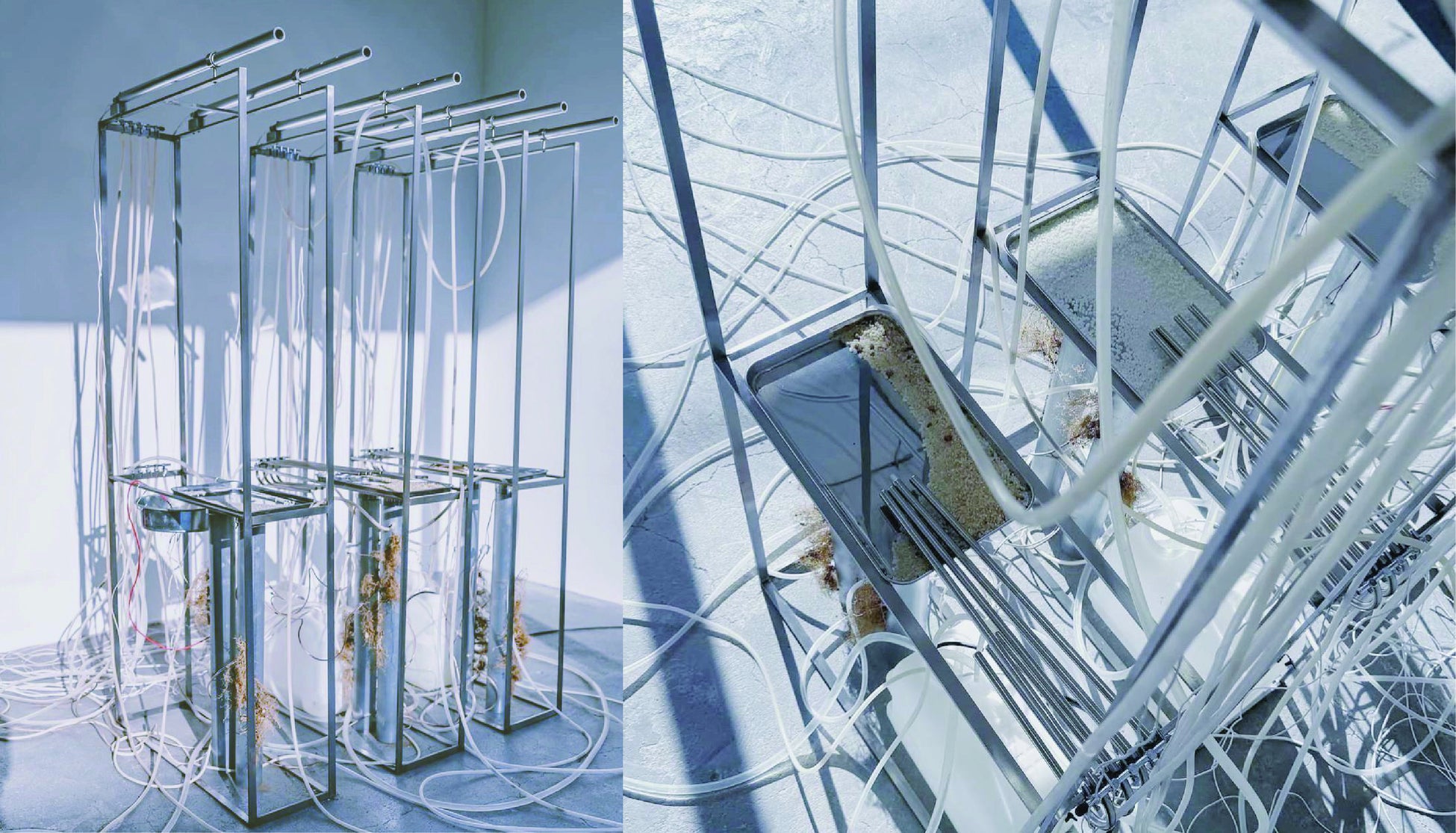 本作は、身体が緊張にどのように応答するのかというプロセスを辿り、痛みを音へと変換する没入型インスタレーションです。塩、熱、そして反応する電子機器いった素材によって、不安定な音環境が立ち上がります。そこに現れる音の周波は、音楽ではなく、生き延びるための信号——ノイズ、脈動、震えとして現れます。鑑賞者は、音が言葉に代わり、記憶が空間の表面にとどまるような、緊張感に満ちた場に足を踏み入れます。そこでは、たとえ姿が見えなくても、身体の存在が強く感じられるのです。