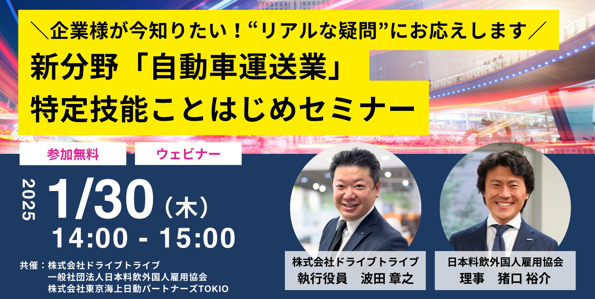 【ウェビナー】新分野「自動車運送業」特定技能ことはじめセミナー、1月30日オンライン開催決定!(ドライブドライブ)