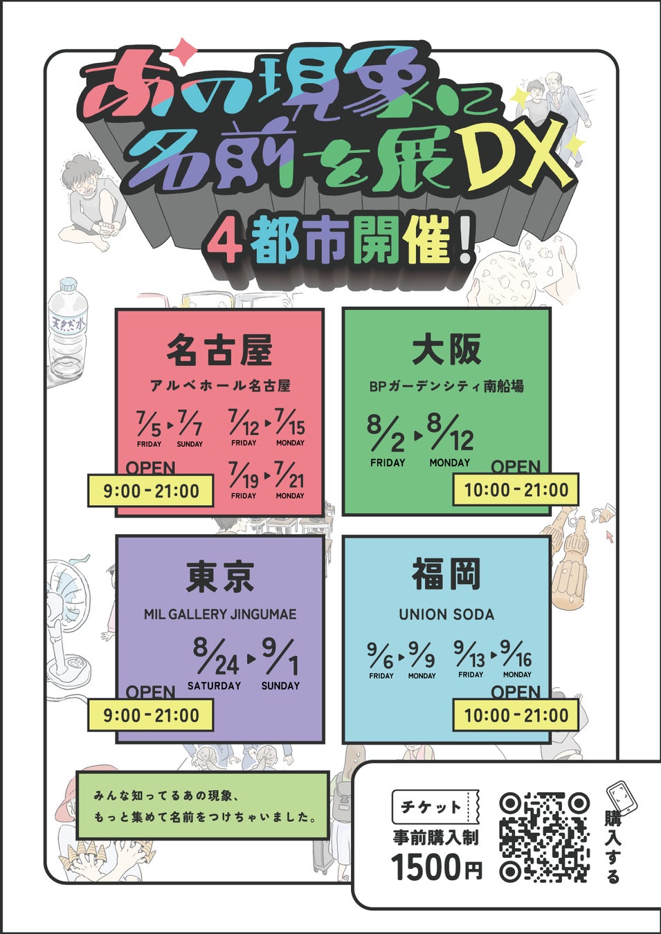 名古屋・大阪・福岡にて累計1万人以上動員した『あの現象に名前を展』を手がけた東海地方を元気にするエンタメの企画屋「株式会社らふがき」は、同シリーズ最新作となる「あの現象に名前を展DX」を7/5〜7/21に名古屋・8/2〜8/12に大阪・8/24〜9/1に東京・9/6〜9/16に福岡で開催します。
