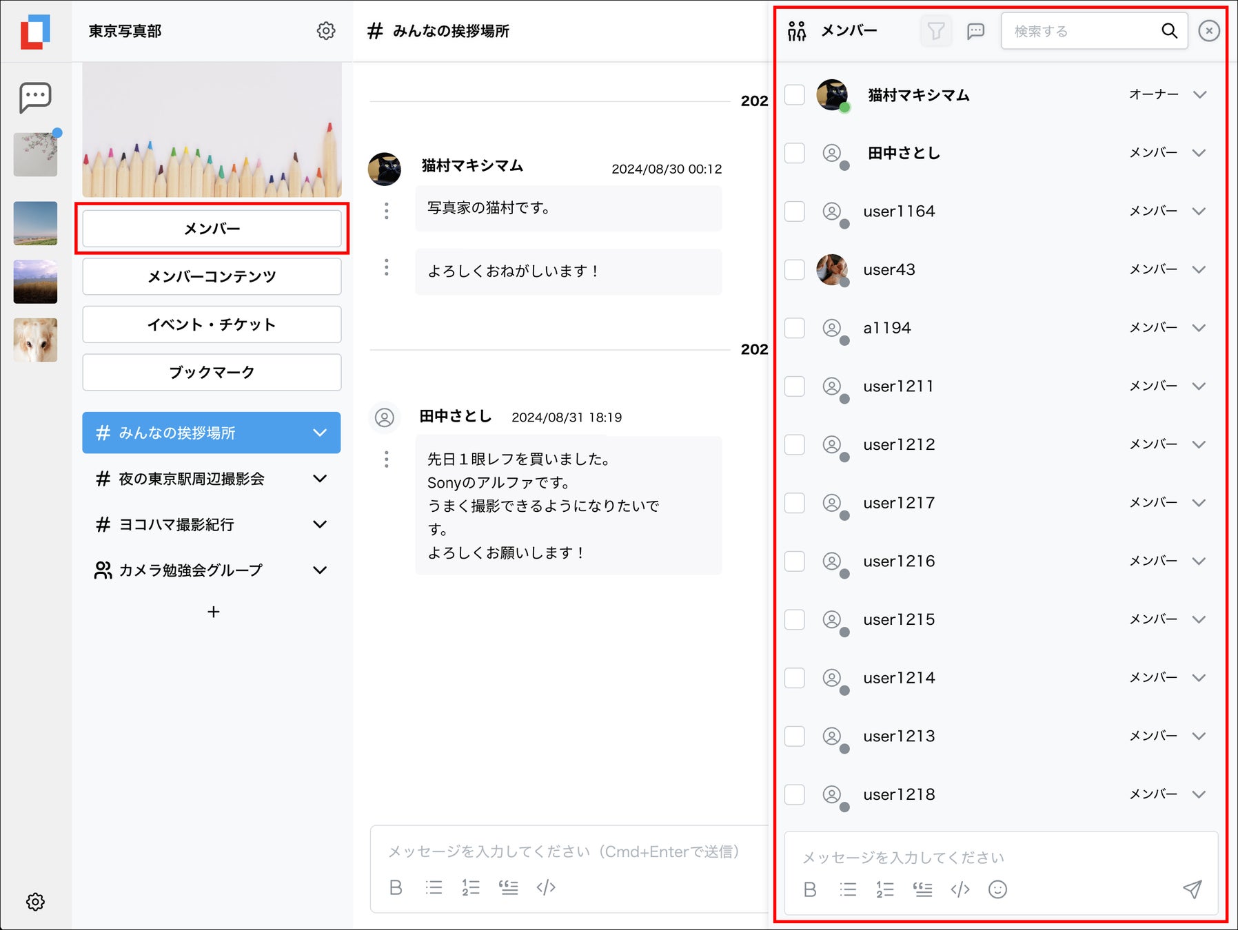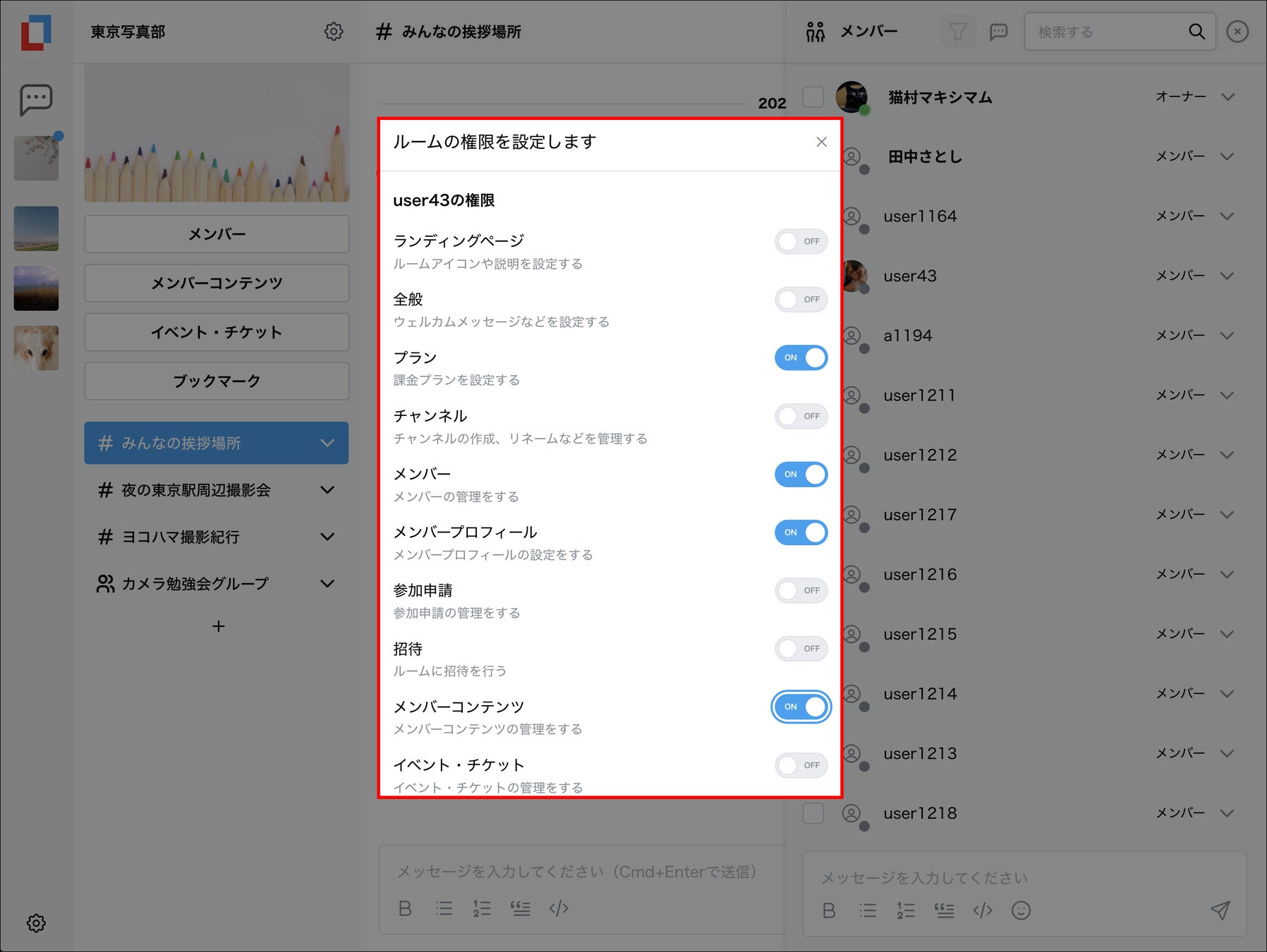 参加したメンバー、招待したメンバーに対し権限を付与する機能です。