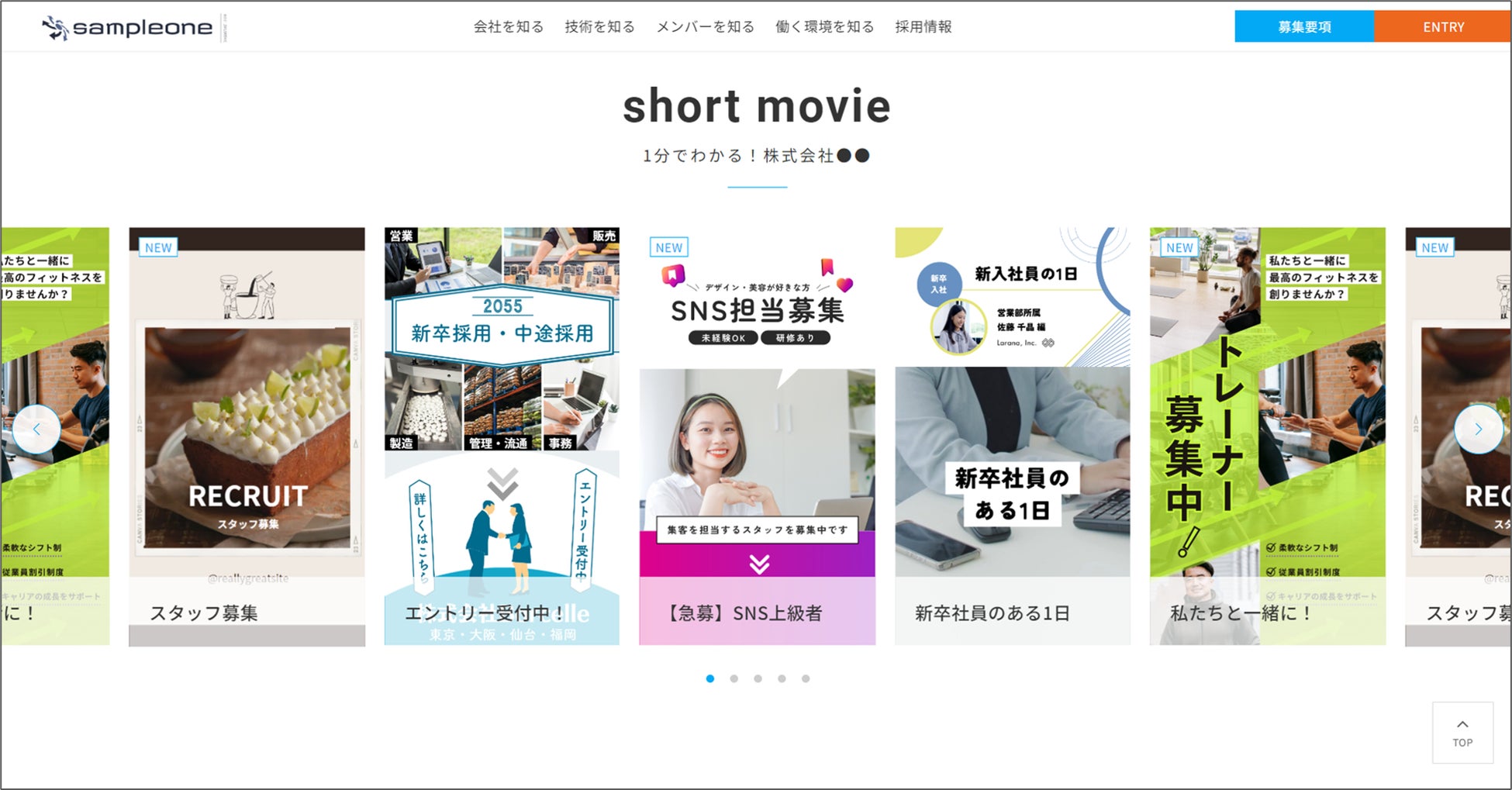 各SNSに投稿したショート動画を採用サイト上でスライド式に一覧表示させることができます。(iRecに直接動画をアップロードし、表示することも可能。)