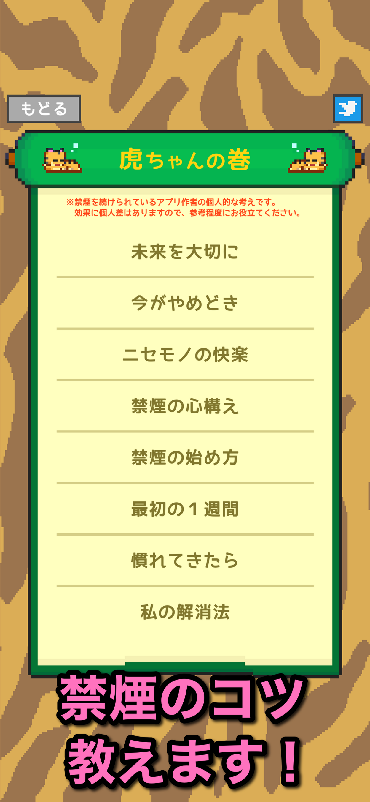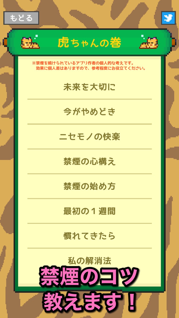 巻物をもつ虎ちゃんをタップすると、アプリ開発者の禁煙に対する考え方やアドバイスが読めます。自分に合ったストレス解消法が見つけられるようサポートします。