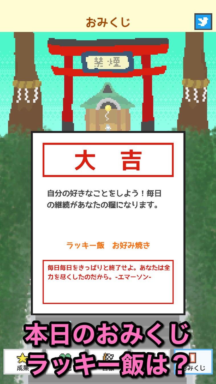 おみくじ機能では、その日の運勢やラッキー飯を占ったり、ランダム表示される偉人の格言を読むことで意識を高めます。禁煙により浮いたお金で、美味しいものを食べましょう!