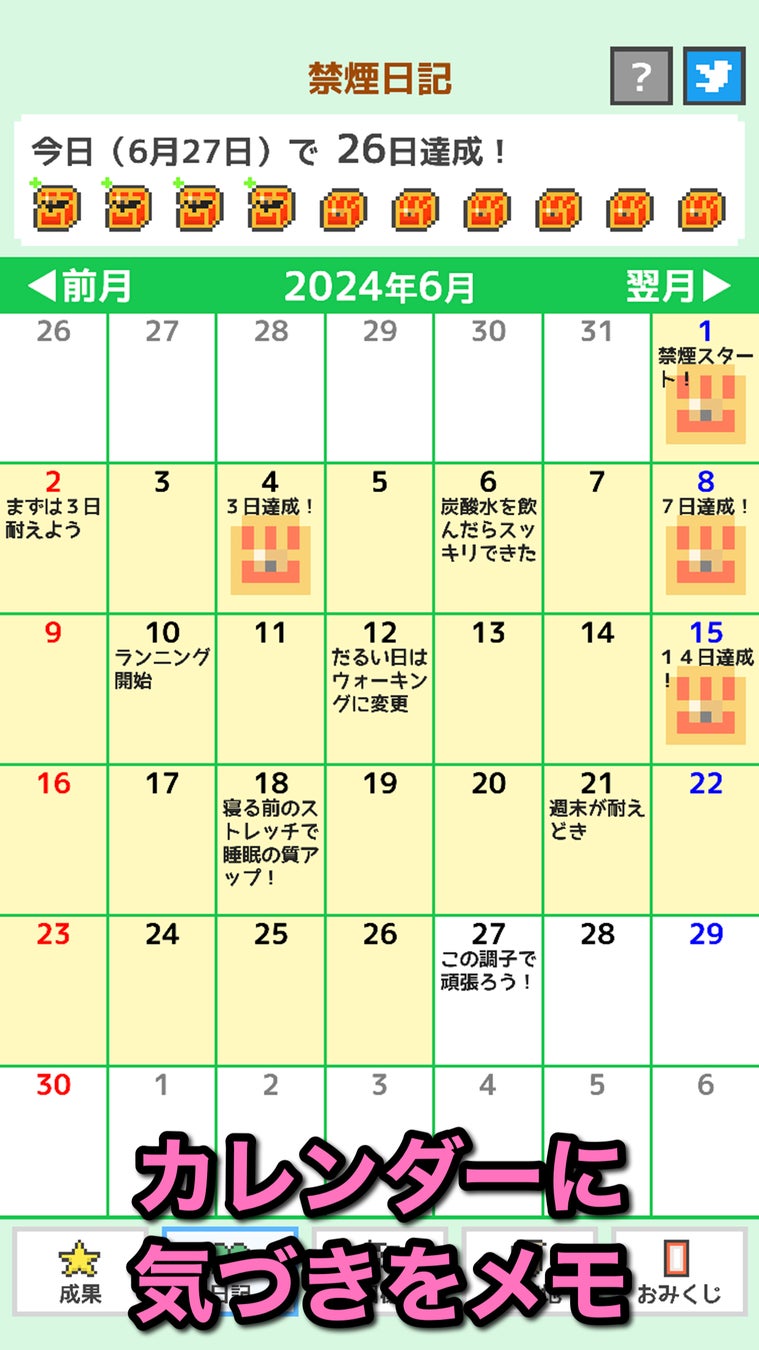 カレンダー機能では、その日気づいた禁煙のコツやメリットをメモすることが出来ます。日々の変化を文字に起こすことで、体の回復を実感します。自分へ用意したご褒美の日もカレンダーから確認できます。