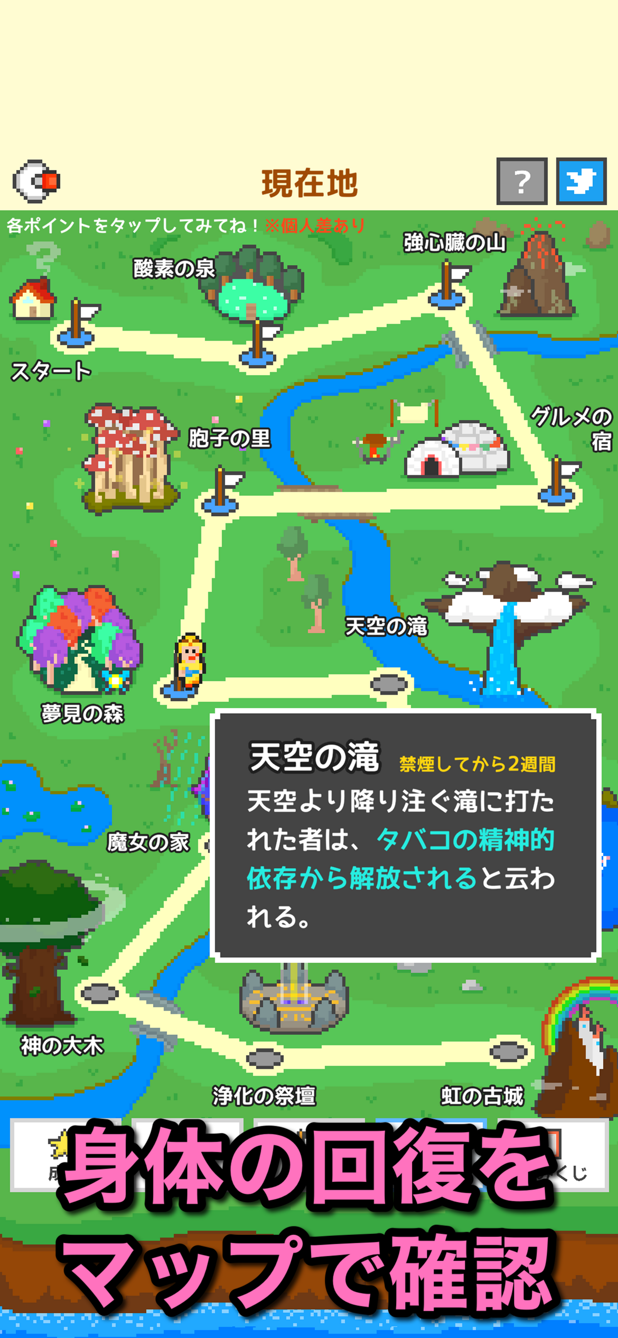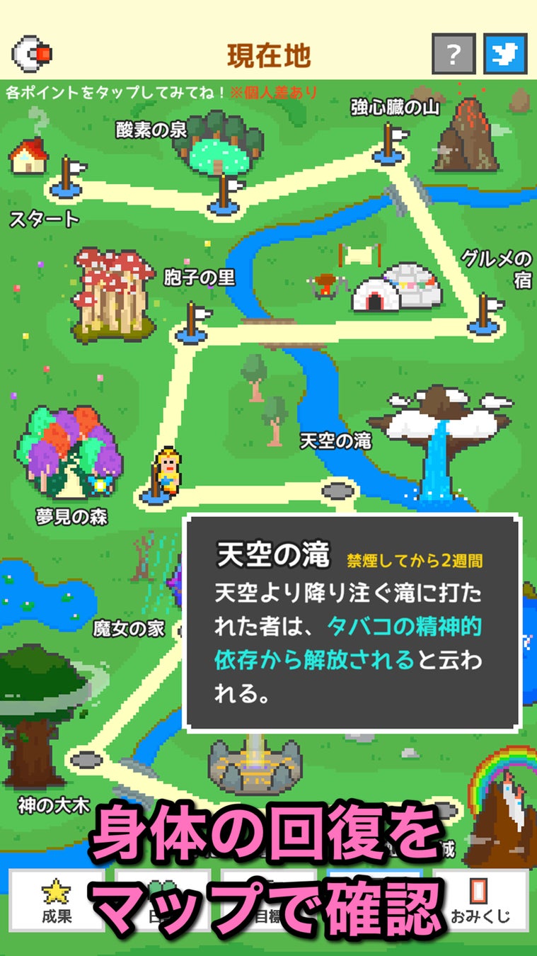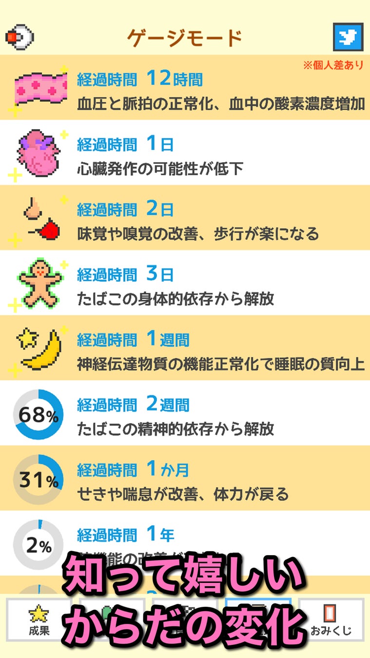 スーファミ世代には懐かしい雰囲気のワールドマップで、禁煙時間の経過による身体の変化を楽しく確認できます。より見やすいゲージモードに切り替えも可能です。