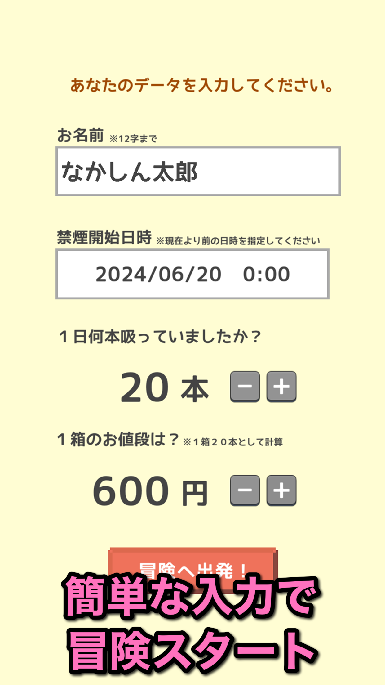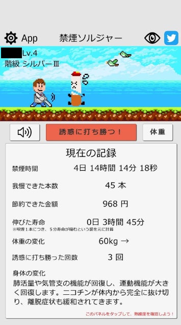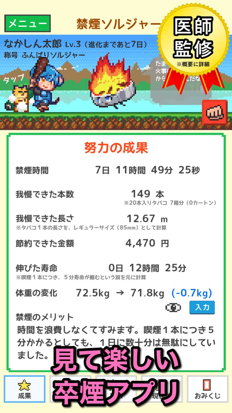 禁煙時間が伸びるごとに強くなっていくキャラクターを自分に投影することで、達成感を増幅させて下さい。