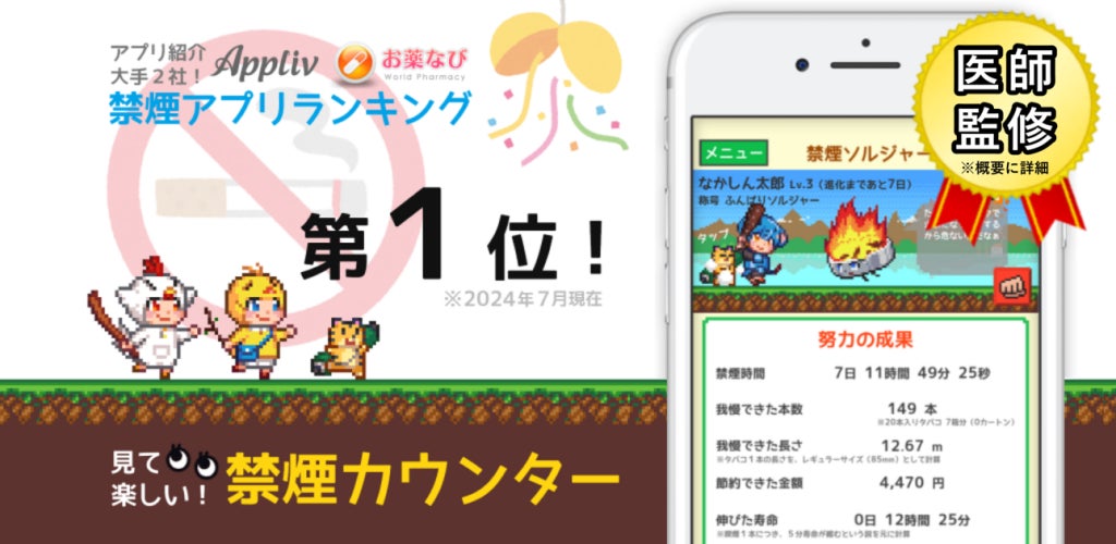 【ゲーム感覚な禁煙アプリ】禁煙ソルジャーが医師監修化!ドット絵の進化でさらに見て楽しく